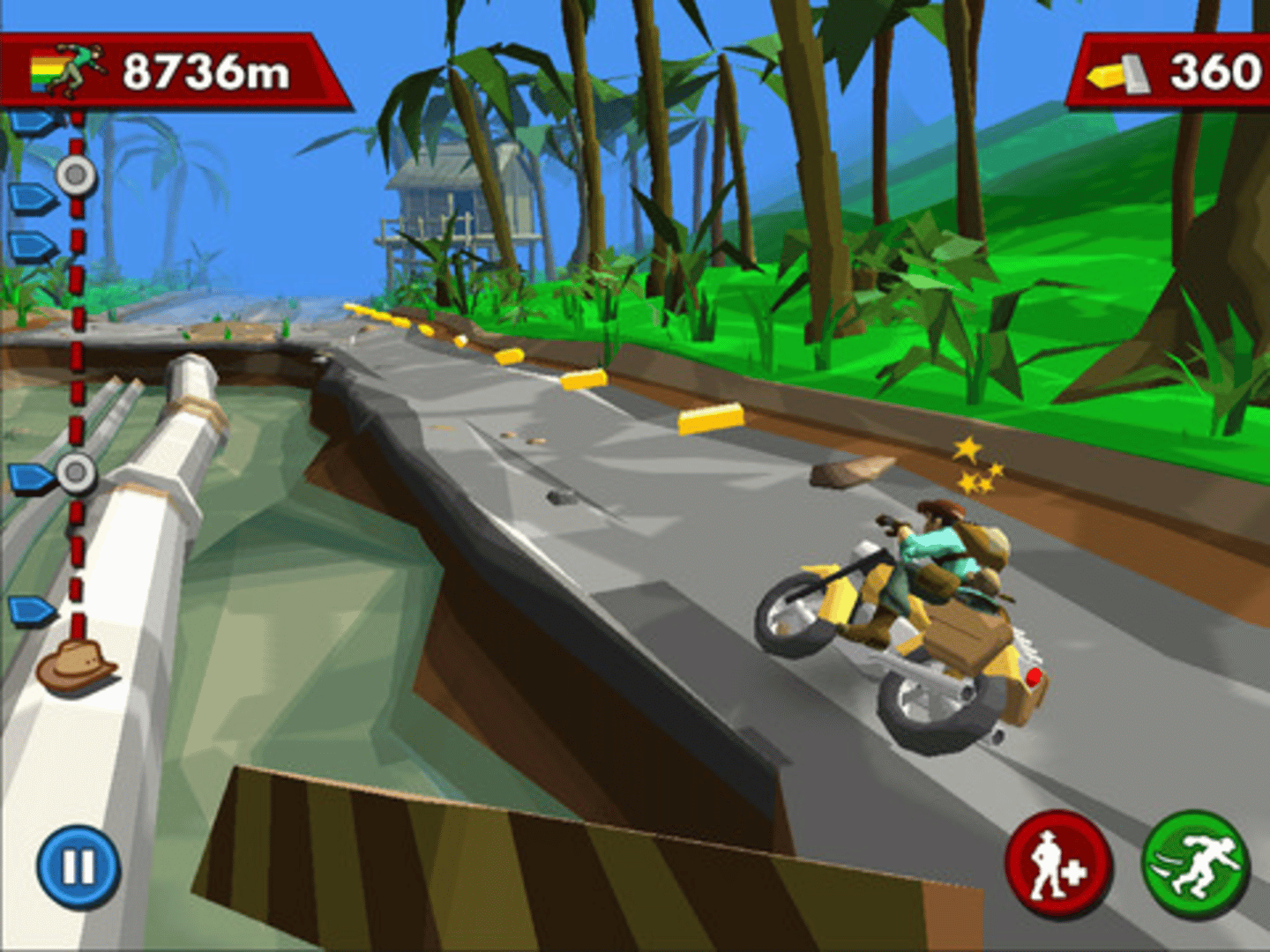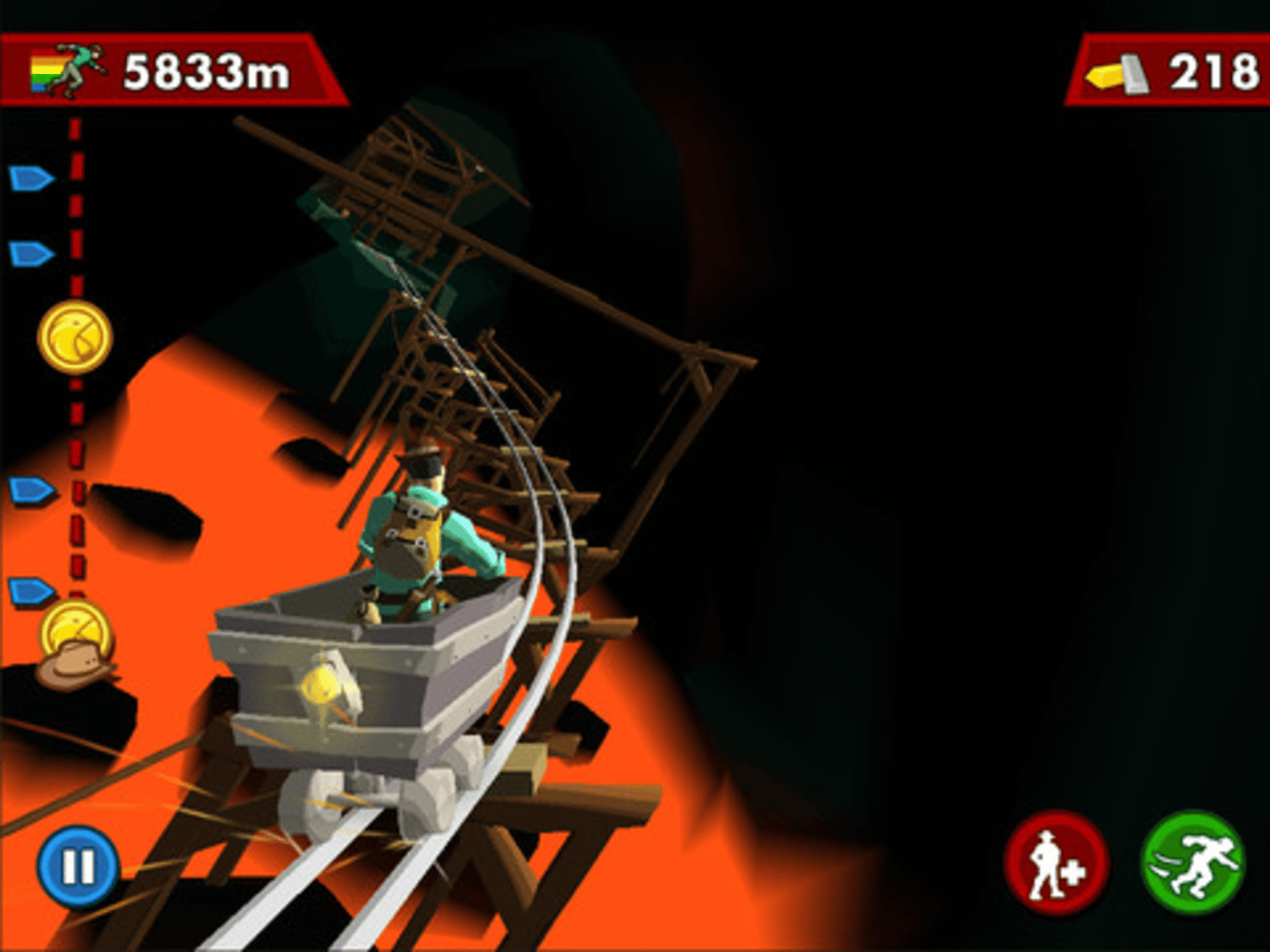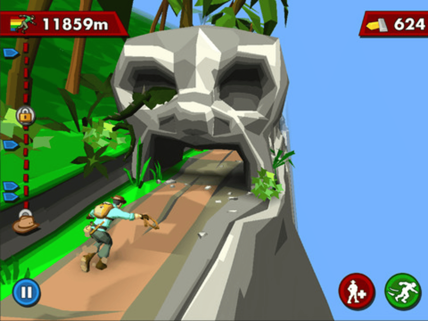 Pitfall! for iOS/Android, reimagined as an infinite runner! Let me introduce myself. I'm Pitfall Harry, veteran jungle explorer. Fortune hunting's my game, and yours, too, if you're daring enough to take this trip with me. Don't be nervous; I'll be your guide through the jungle, and I'm one of the best. Untold riches are waiting for us in there, but so are dangers a dozen times over. We'll be swinging on vines over bottomless tarpits. We'll be hopping across swamps, using crocodile heads like stepping stones. We'll be searching underground through dark passageways crawling with killer scorpions. So pack up your backpack and meet me at the jungle at dawn - and we'll be off to seek a king's ransom in gold, diamonds and lost treasures - in Pitfall Harry's Jungle Adventure.
