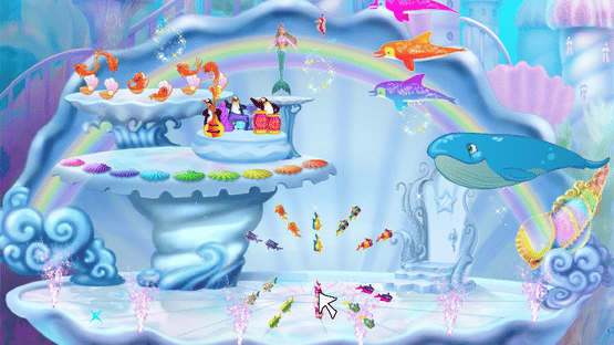 In Barbie Mermaid Adventure, Barbie assumes the role of a specimen of that mythical fish-human hybrid, the mermaid, and plans a party with all of her undersea friends. Unfortunately, a magical light shell in the main palace broke. In order to fix it, Barbie needs to enlist the help of 3 rainbow dolphins. Explore three exotic undersea worlds!; Play seven fun-filled games and activities!; Care for cuddlefish, free Whisper the whale, and more!; Collect decorations and hand out party invitations!; Help Mermaid Barbie and her friends compose the "Song of the Sea"!; Play two of a kind with school fish and watch them dance at the celebration and design a crown and necklace for Barbie to wear!