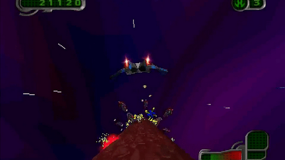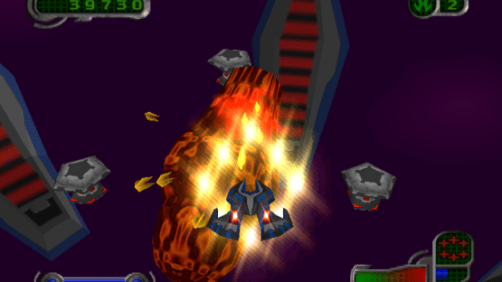 A ground-based shoot-em-up by design, the game employs the use of jumping, banking, and strafing as you move forward through 3D tube-like levels. The game is seem from a third-person perspective behind the ship. Some areas place you outside and some inside, but the majority of the game takes place rotating around tubes. This gameplay only differs slightly in boss levels, that allow you to rotate around a central point with no forward motion. You can obtain different power-ups including special weapons, health bonuses and extra lives as you play through the game’s 9 levels. Each level is divided into 2 stages, one on tubes and a boss fight afterwards.