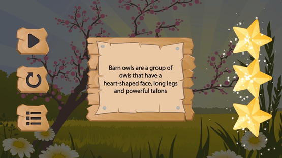 In Owls, children match random pairs of owls to clear the screen. After successfully completing each level, they are rewarded with a little fact about owls. The Parliament School for Owls is very serious about the Buddy System. Every Owl has a buddy, and is not allowed to come in from recess without them. Your job is to help the Owls find their buddy and get in for lunch! Learn about Owls, watch the seasons change and see how quickly you can send the Owls home. Can you earn 3 stars in every level? Every 25 levels the seasons change from Spring to Summer, Fall and Winter. They can earn up to 3 stars per level depending on how quickly they clear the screen, and go back as many times as they wish to retry.