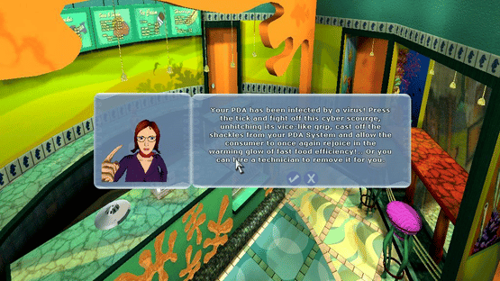 Every aspect of running a small Hot Dog stand (and ultimately a thriving empire) is incorporated into this light-hearted simulation. Design your stores based on what your customers tell you they like. Staff relations play a big role in the game. Each potential employee has their own personality, and can be offered gifts, improved training and vacation time, all of which will have an affect on the quality of their work. Designing the staff costume also has a big effect on how marketable your store is. It's not always peaceful work; you will face robberies, infestations of viruses, and even aliens. A boxing mini-game sees you deal with angry customers, while you can run your company outside of the law, with the help of the Mafia for espionage and intimidation.