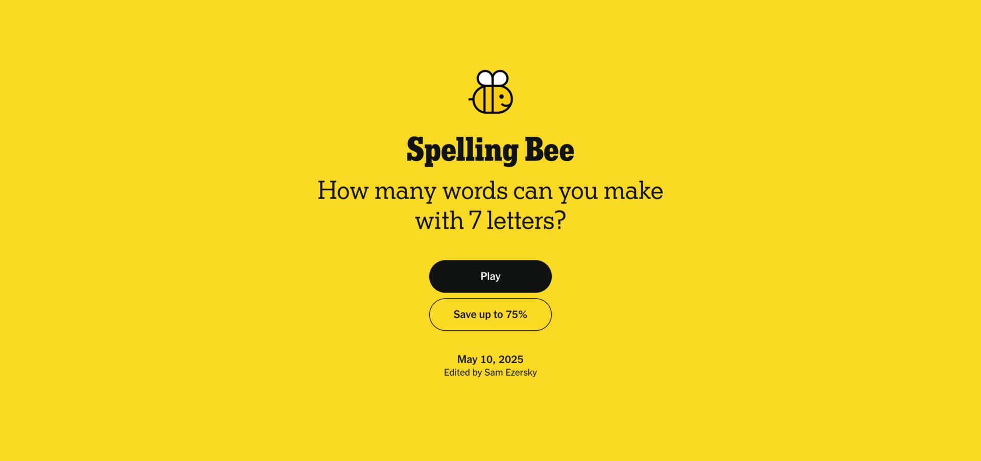 Spelling Bee is a word game distributed in print and electronic format by The New York Times. The game presents players with a grid of seven letters arrayed in a honeycomb structure. The player scores points by using the letters to form words consisting of four or more letters. However, any words proposed by the player must include the letter at the center of the honeycomb. Scoring points leads to progressively higher praise for the player's effort, such as "Solid", "Amazing", and "Genius". Each puzzle is guaranteed to have at least one pangram, which awards the player the largest number of points when found. If the player finds all of the possible words in a given puzzle, they achieve the title of "Queen Bee".