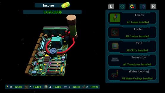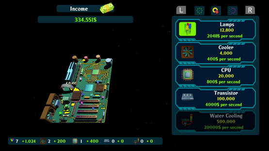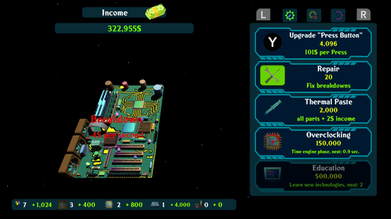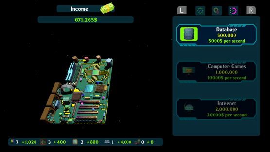 “Cyber Engine” is an incremental game where you need to build a supercomputer in a futuristic style of technology. Pressing a “Square” button on the gamepad rewards the player with currency. The player may spend the currency to purchase items or abilities that allow the player to earn the currency faster or automatically. The goals are to build a full cyber engine and earn a billion dollars.