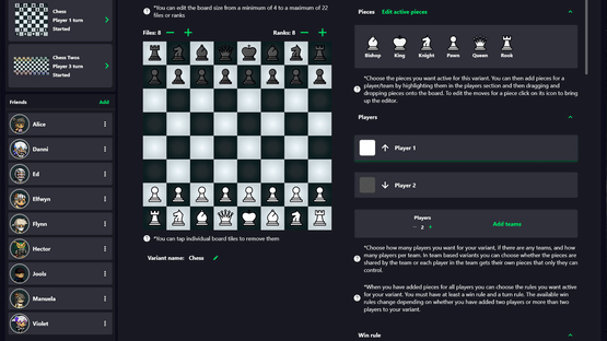 Omnichess is the game that allows you to design and play your very own chess variants! With AI and online play there are a huge variety of options.