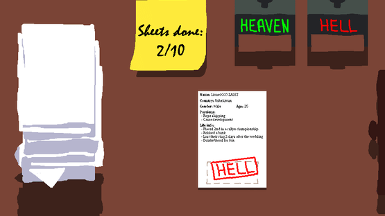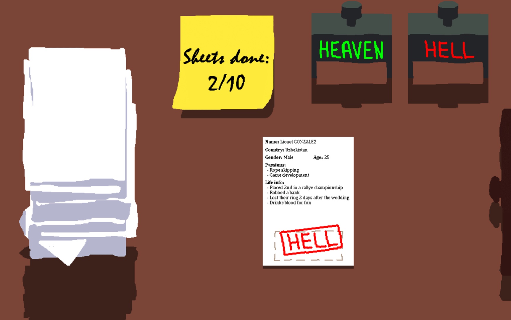 You, the player, are a purgatory Intern who has to take of all the paperwork the day after Everybody Died. By reading through each person's personal info sheet, you must judge whether they deserve to go to Heaven or to go to Hell.