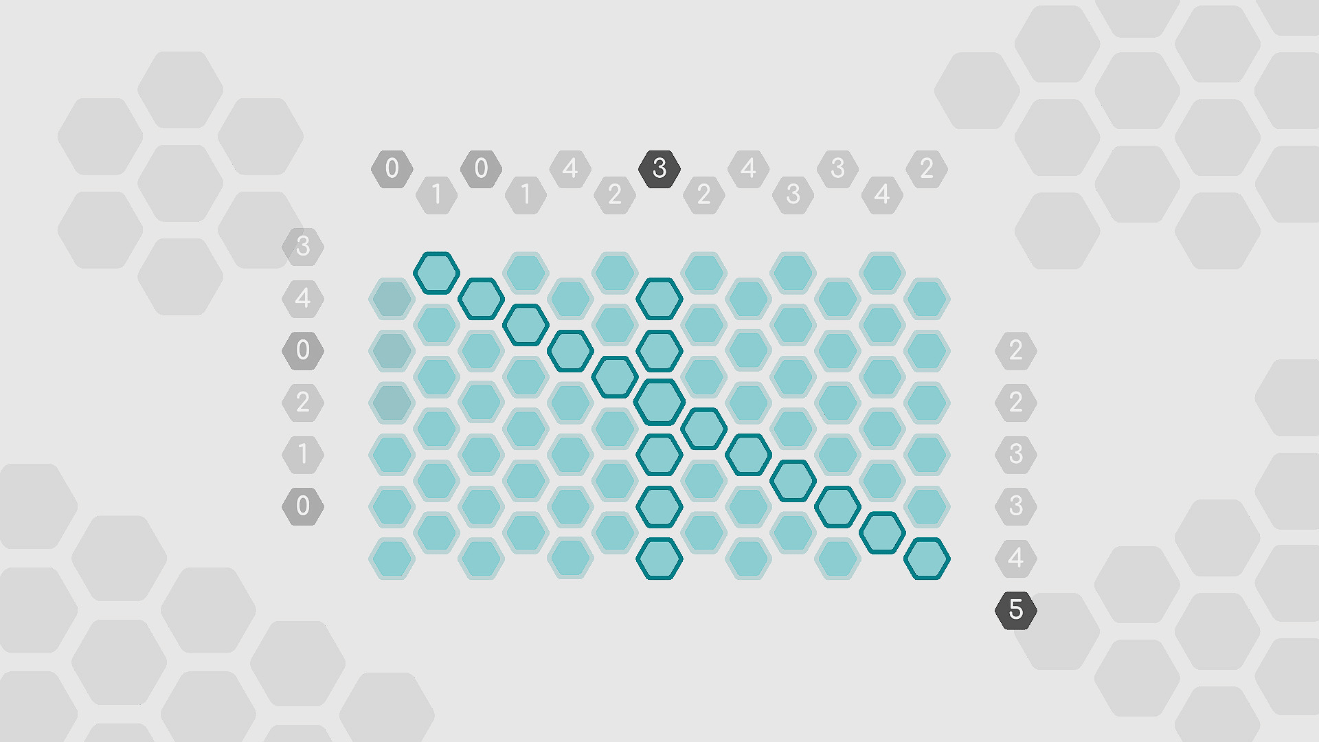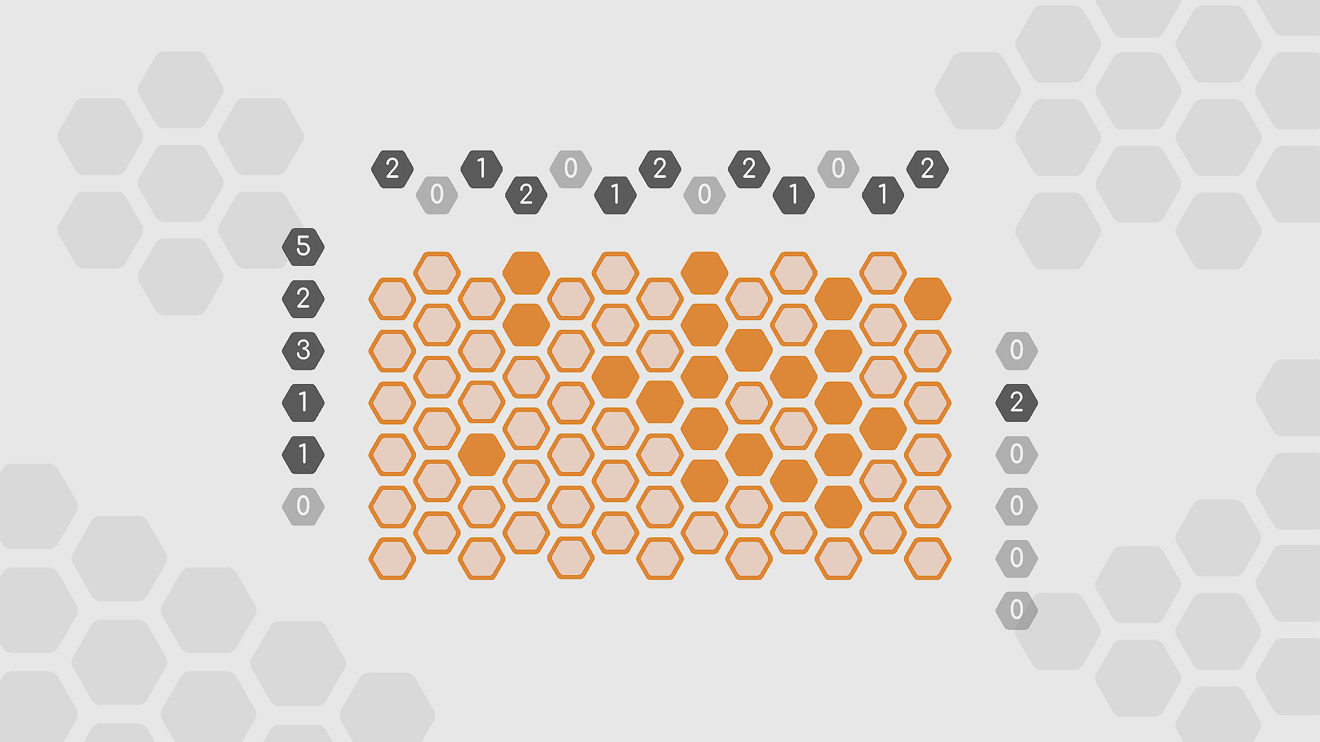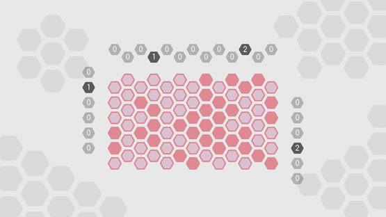 A picross game on a hex grid with a beautiful minimal design and a sound environment prepared exclusively. Click to color the hexagonal cells so that all columns and diagonals are zero.