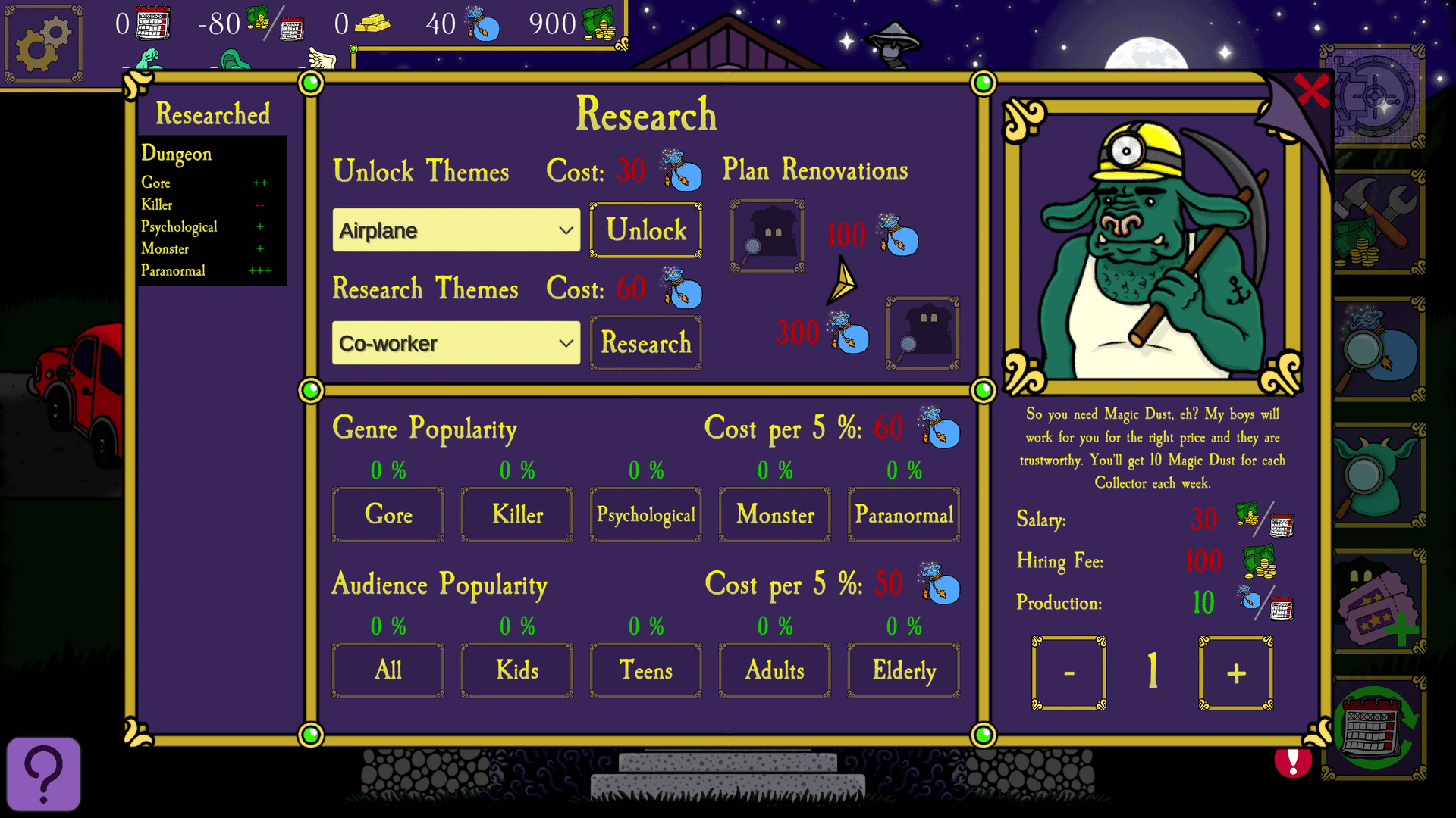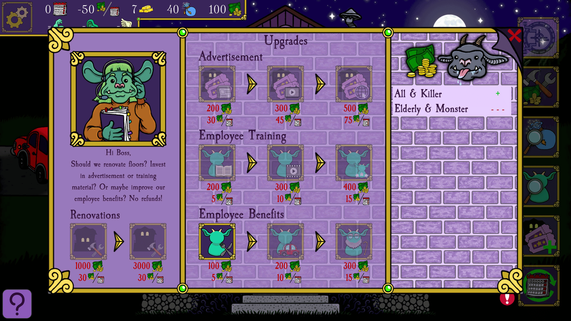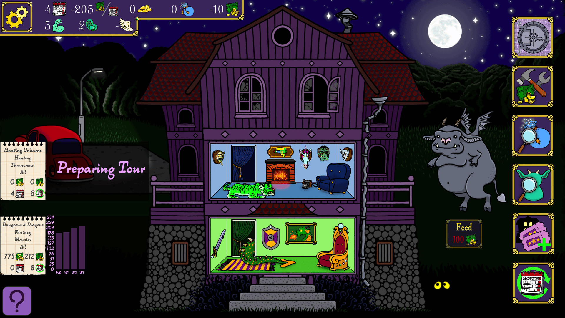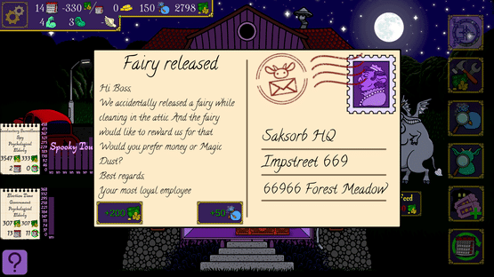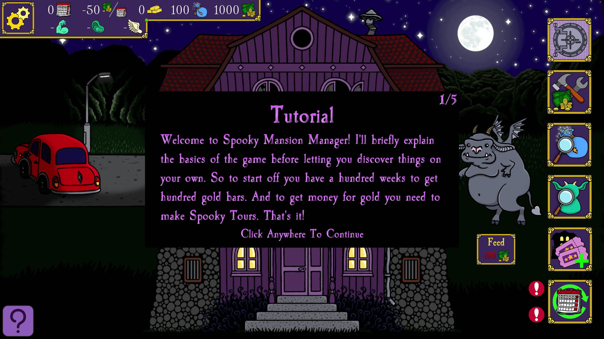 Spooky Mansion Manager is a turn-based management game where you create Spooky Tours in a mansion you inherited from your grandpa. Ultimate goal is to acquire a hundred gold bars in as many weeks to pay back a loan. NOTE: This is not a scary game (ie. it doesn't have any jump scares etc.)