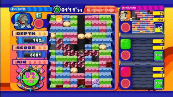 Players take on the role of a driller moving through levels of colorful blocks, avoiding the threat of being crushed by falling blocks, all while keeping their air supply from running out. Mr. Driller Online features single player modes including Standard Driller and Quest Driller, as well as online multiplayer support for up to four players on Xbox LIVE. In online multiplayer mode, players can participate in a split screen Solo Battle, where the best score wins, or in Tag Battle, where friends team up in pairs to beat the game.
