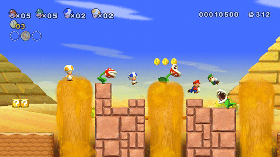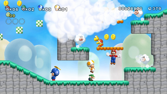 New Super Mario Bros. Wii is a side-scrolling 2.5D Mario platformer for the Wii and the tenth game in the Super Mario series. In addition to the single-player experience, New Super Mario Bros. Wii also features a multiplayer mode for up to four players. This is the first Super Mario game to feature co-op and vs. modes at the same time since Mario Bros. It features more items, new levels, and more enemies than the DS predecessor. The game introduces two new power-ups, the Propeller Mushroom and the Penguin Suit, which turn characters into their propeller and penguin forms, respectively.