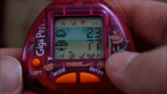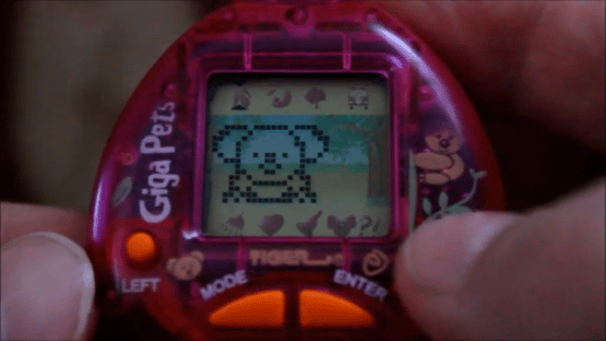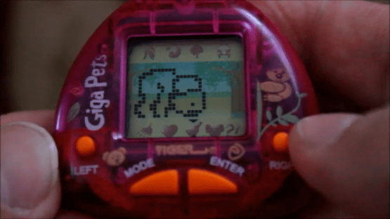 Giga Pets are digital pet toys. Available in a variety of different characters, each Giga Pet is a palm-sized unit with an LCD screen and attached key ring. To ensure a happy, healthy pet, its owner has to take care of it similar to how one might care for a real animal, including feeding, cleaning, and playing with their Giga Pet.