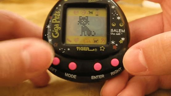 Giga Pets are digital pet toys. Available in a variety of different characters, each Giga Pet is a palm-sized unit with an LCD screen and attached key ring. To ensure a happy, healthy pet, its owner has to take care of it similar to how one might care for a real animal, including feeding, cleaning, and playing with their Giga Pet.
