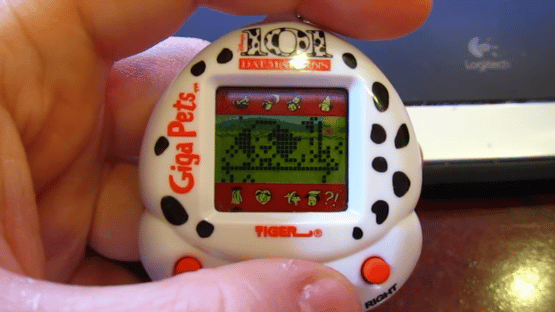 Giga Pets are digital pet toys. Available in a variety of different characters, each Giga Pet is a palm-sized unit with an LCD screen and attached key ring. To ensure a happy, healthy pet, its owner has to take care of it similar to how one might care for a real animal, including feeding, cleaning, and playing with their Giga Pet.