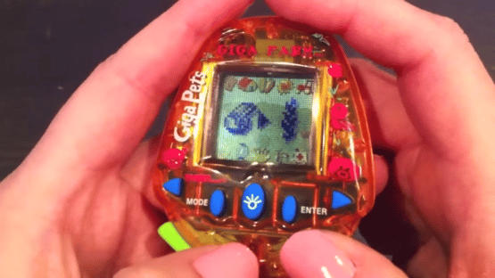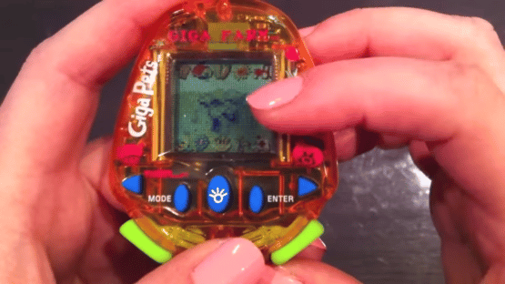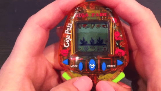 Giga Pets are digital pet toys. Available in a variety of different characters, each Giga Pet is a palm-sized unit with an LCD screen and attached key ring. To ensure a happy, healthy pet, its owner has to take care of it similar to how one might care for a real animal, including feeding, cleaning, and playing with their Giga Pet.