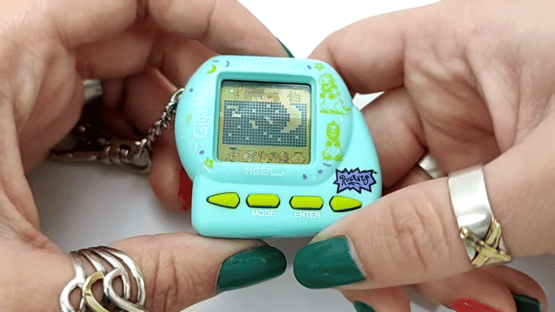 Giga Pets are digital pet toys. Available in a variety of different characters, each Giga Pet is a palm-sized unit with an LCD screen and attached key ring. To ensure a happy, healthy pet, its owner has to take care of it similar to how one might care for a real animal, including feeding, cleaning, and playing with their Giga Pet.