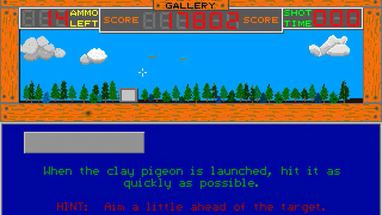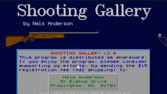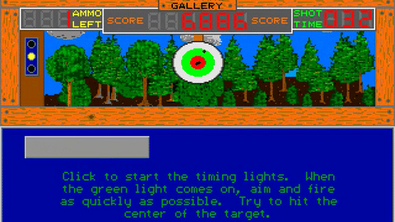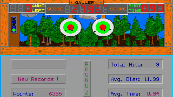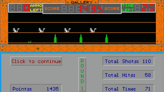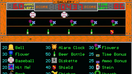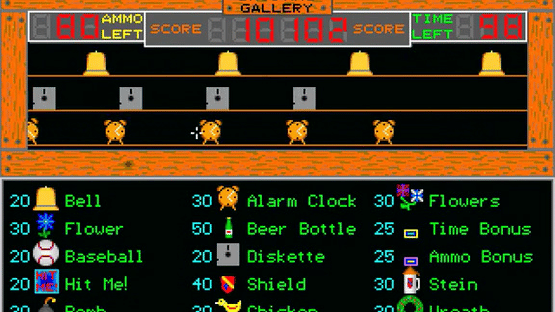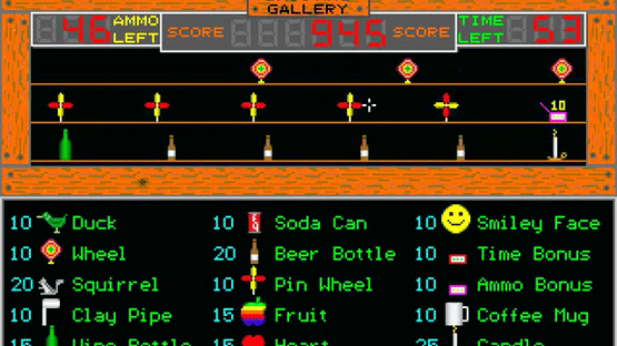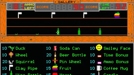 Shooting Gallery is a simple game for DOS simulating a shooting gallery. You control mainly with the mouse to aim and try to hit targets to score points. The game is divided into 7 rounds where each round has a different shooting game or a little bit more difficult version of a previous round. Round 7 is always the Shootout which is a race against time to shoot as many badies as you can before the time limit runs out.