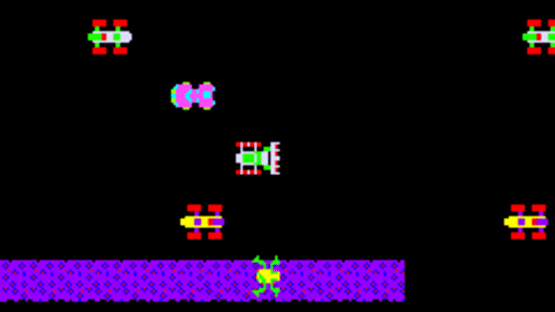 Your task in this arcade game is to guide a frog across a treacherous road and river, and to safety at the top of the screen. Both these sections are fraught with a variety of hazards, each of which will kill the frog and cost you a life if contact is made.