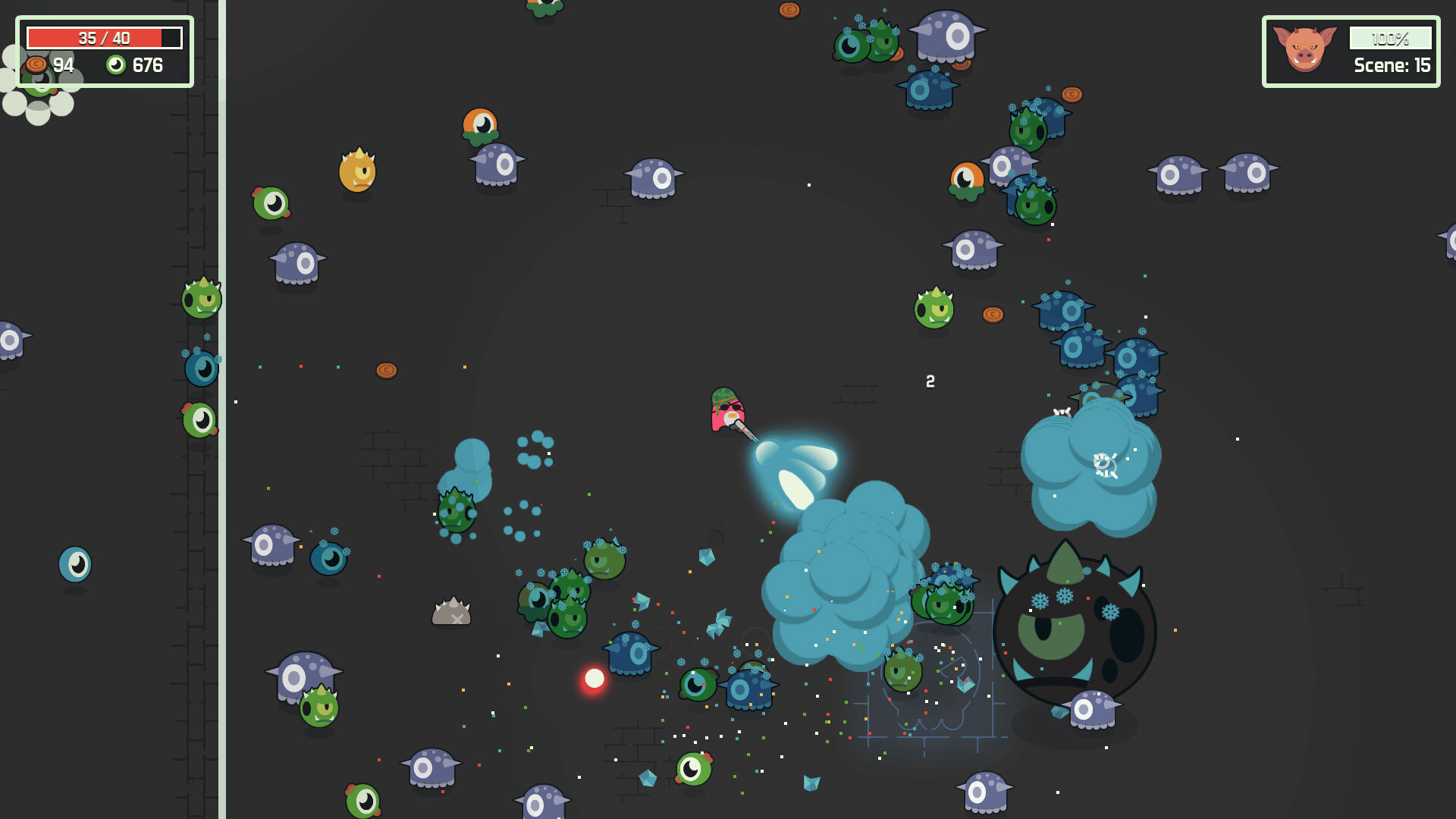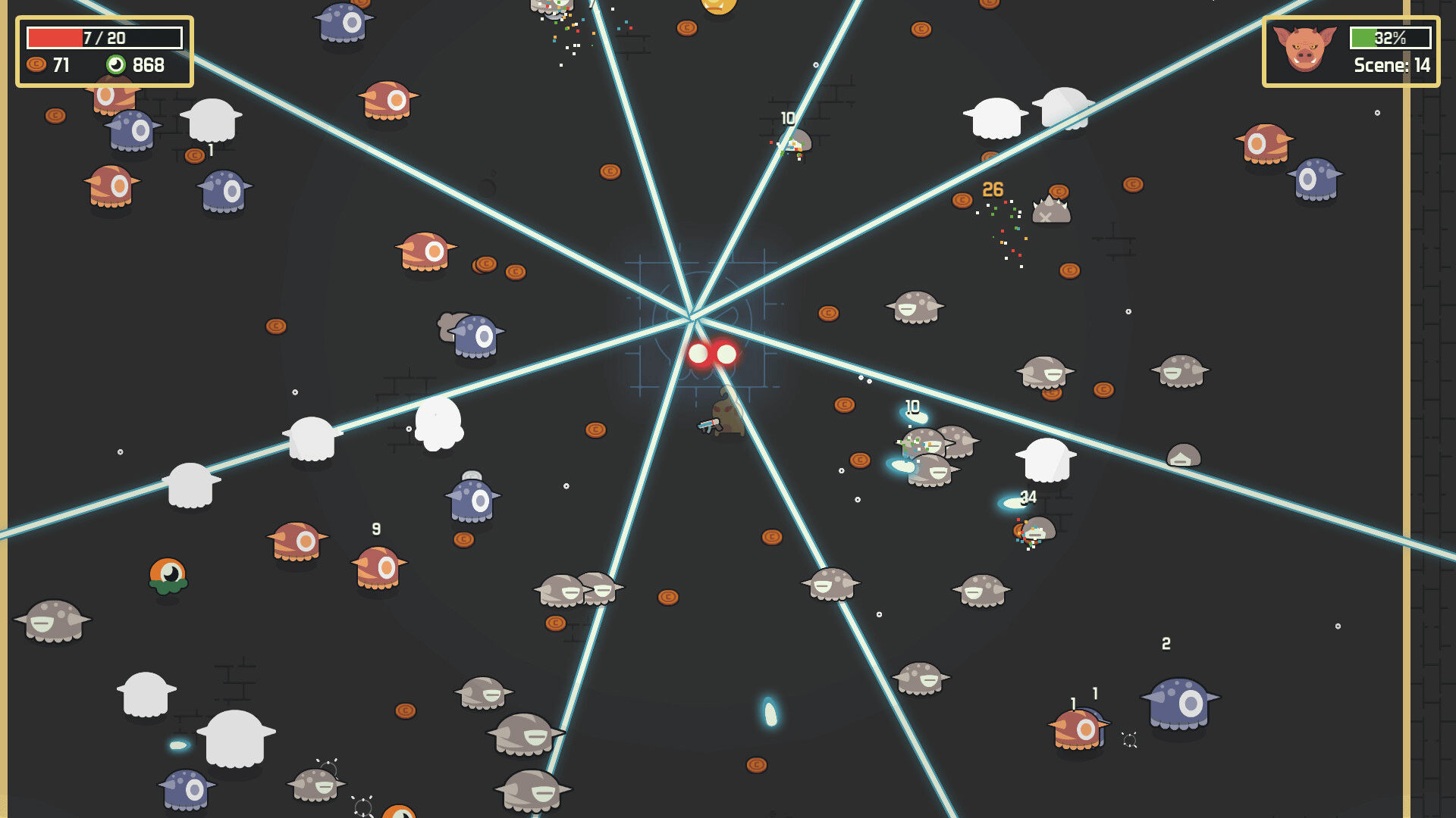 Collect synergizing items to create an overpowered character to fight hordes of cyclops monsters. Cyclo Chambers is a fast-paced, top-down arena shooter with light rogue-like elements. 200 items to choose from to create frantic combinations. Different runs every time.