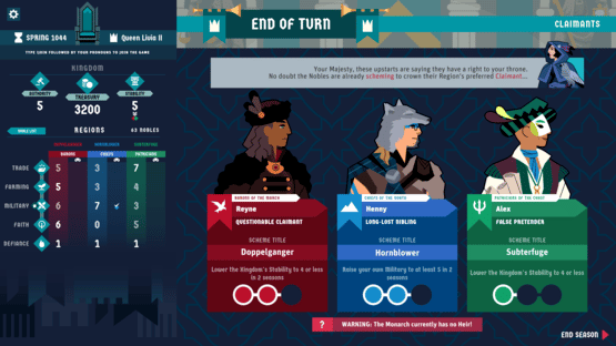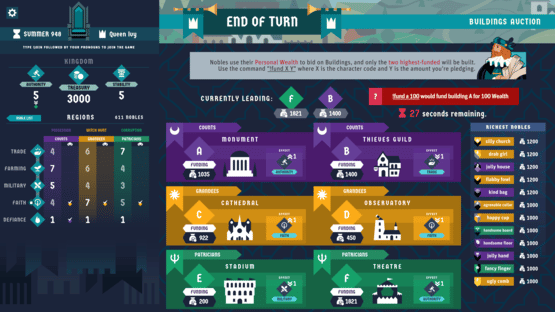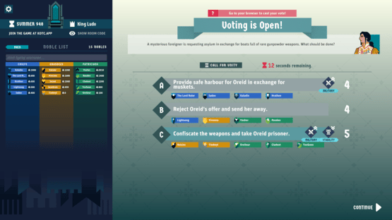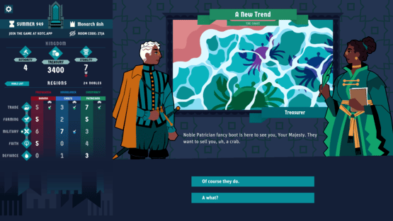 King of the Castle is a Twitch-integrated social narrative game for 4-4000 players. The streamer plays the Monarch while everyone else plays the squabbling Nobles of their Council, who can vote on every decision and change the course of the Kingdom's history.