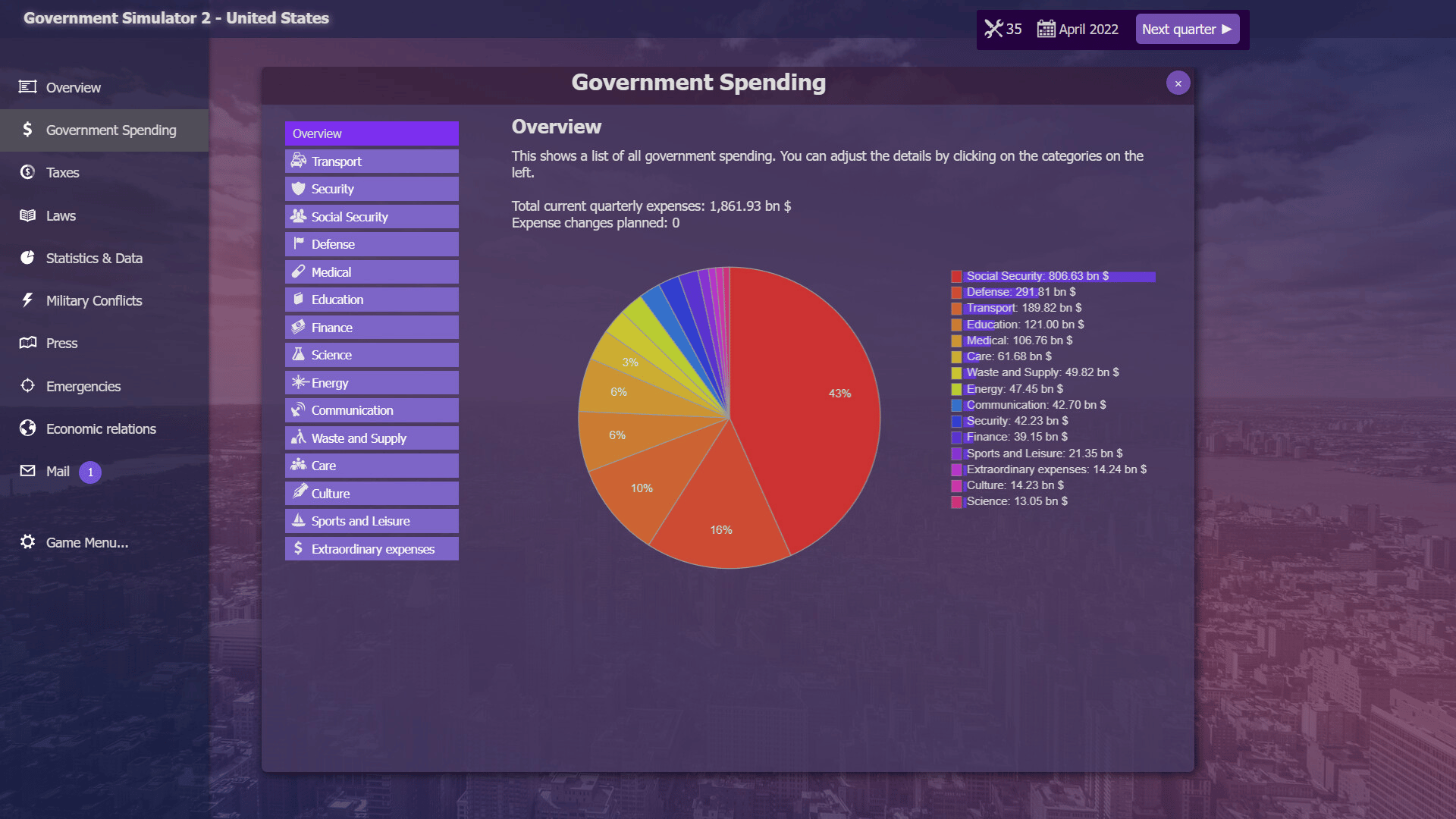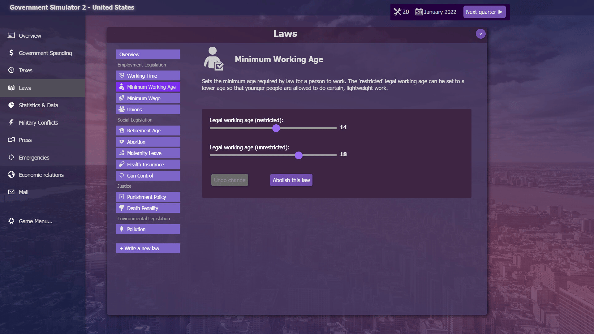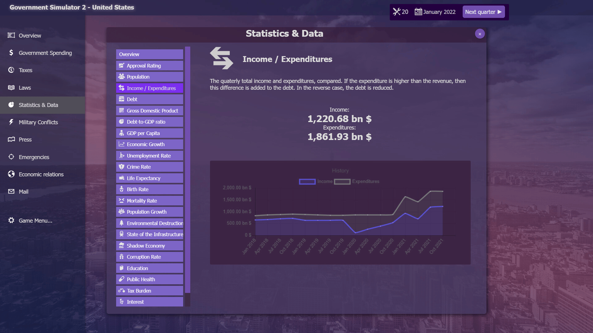 Government Simulator 2 is based on real world statistics and data and lets you control a whole country, like the USA, Germany, UK, France, Russia, and others: Change laws, taxes and budgets, and see what happens. Manage emergencies, impose tariffs, start wars.
