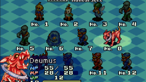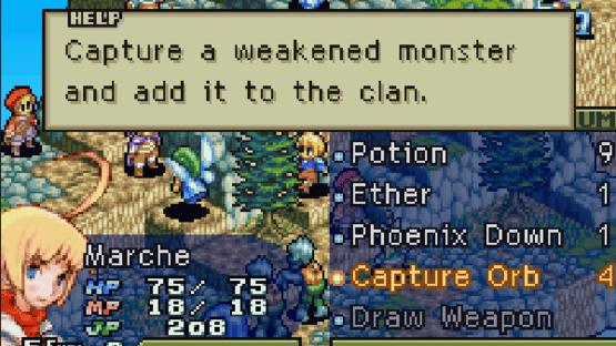 Final Fantasy Tactics Advanced Battle is a hack that brings monster taming to Final Fantasy Tactics Advance, and makes the whole experience centered around this mechanic. The player can use a new item (the Capture Orb) to capture monsters which (unlike in the vanilla game) join the party and fight on your side. Additionally, all ways to get new humanoid party members have been disabled, the player needs to make do with only monsters and the two starting humanoid party members. A new system to learn abilities is implemented, similarly to the original Final Fantasy Tactics the units will earn JP which they can spend directly on purchasing abilities. This is the only way the player has to teach new abilities to the monsters.
