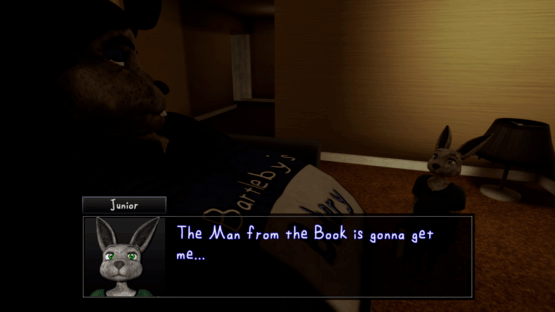 Mama Rabbit returns home from work one late night. Awake long past his bedtime, a frightened Junior Rabbit rushes in. The book in his hands has very visibly spooked him, and Mama Rabbit tries convincing him that it's only a story. But then a tap-tap-tapping begins on the window...