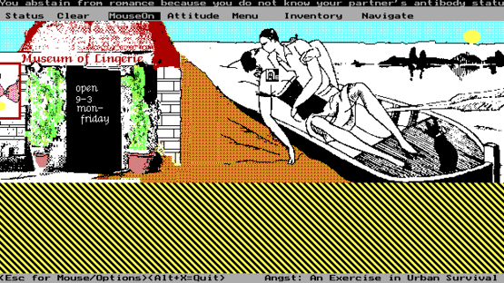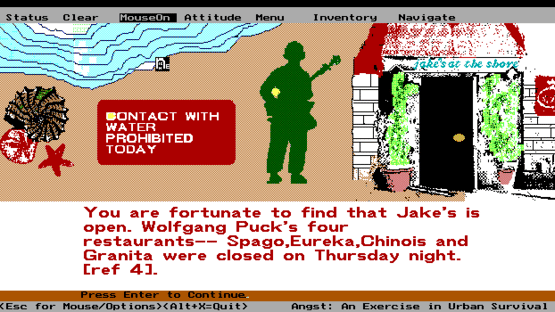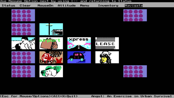 Angst: A Game Of Urban Survival is a single player, shareware adventure game based on the Los Angeles riots of 1992. The game uses a DOS Window to frame and run the game. The player starts the game and is shown a scene which puts the player on a motorway junction outside the city. They then use the menu bar to select an attitude with which to approach the scene and an item, attitudes range from Conservative to Green while the items range from an uzi to a breath mint. The player then enables their mouse and clicks on the picture, anywhere that is coloured yellow is a link to something, sometimes the link does not do a great deal, for example in 'The Fun Zone' clicking on another character brings up a message "You refrain from romance because you do not know your partner's antibody status". Other hot spots though open up other scenes and this is how the player progresses through the game. What is the point of the game? Who knows? The game's documentation is deliberately enigmatic saying only: "Object of Game : Up to you to determine. Characters and scenes may give you a hint" but the manual also makes it clear that it is possible to win, that it is also possible to die, and it is possible to get stuck by not possessing the right item in the right place.