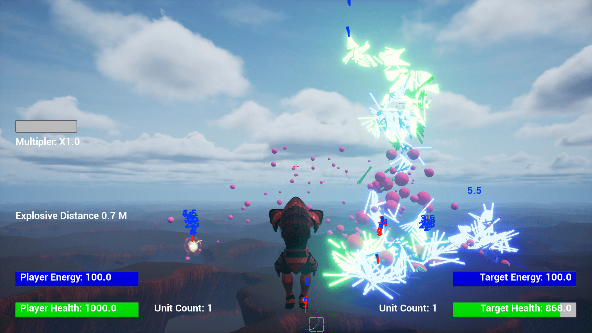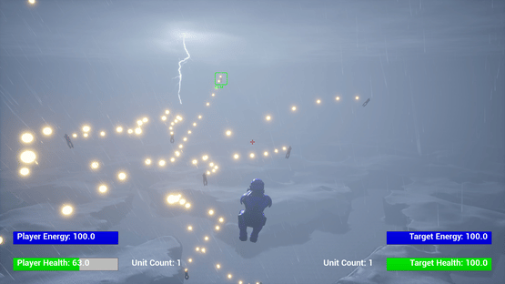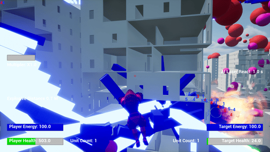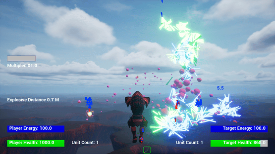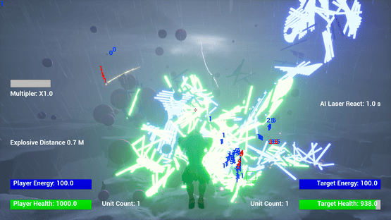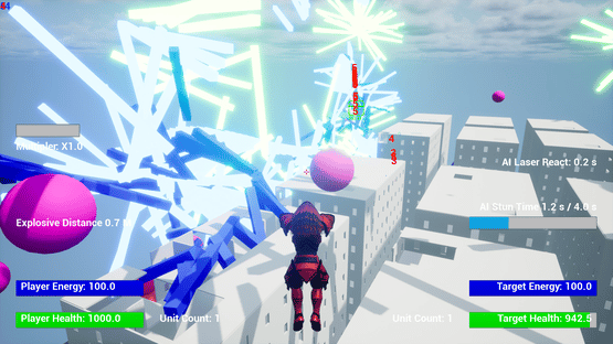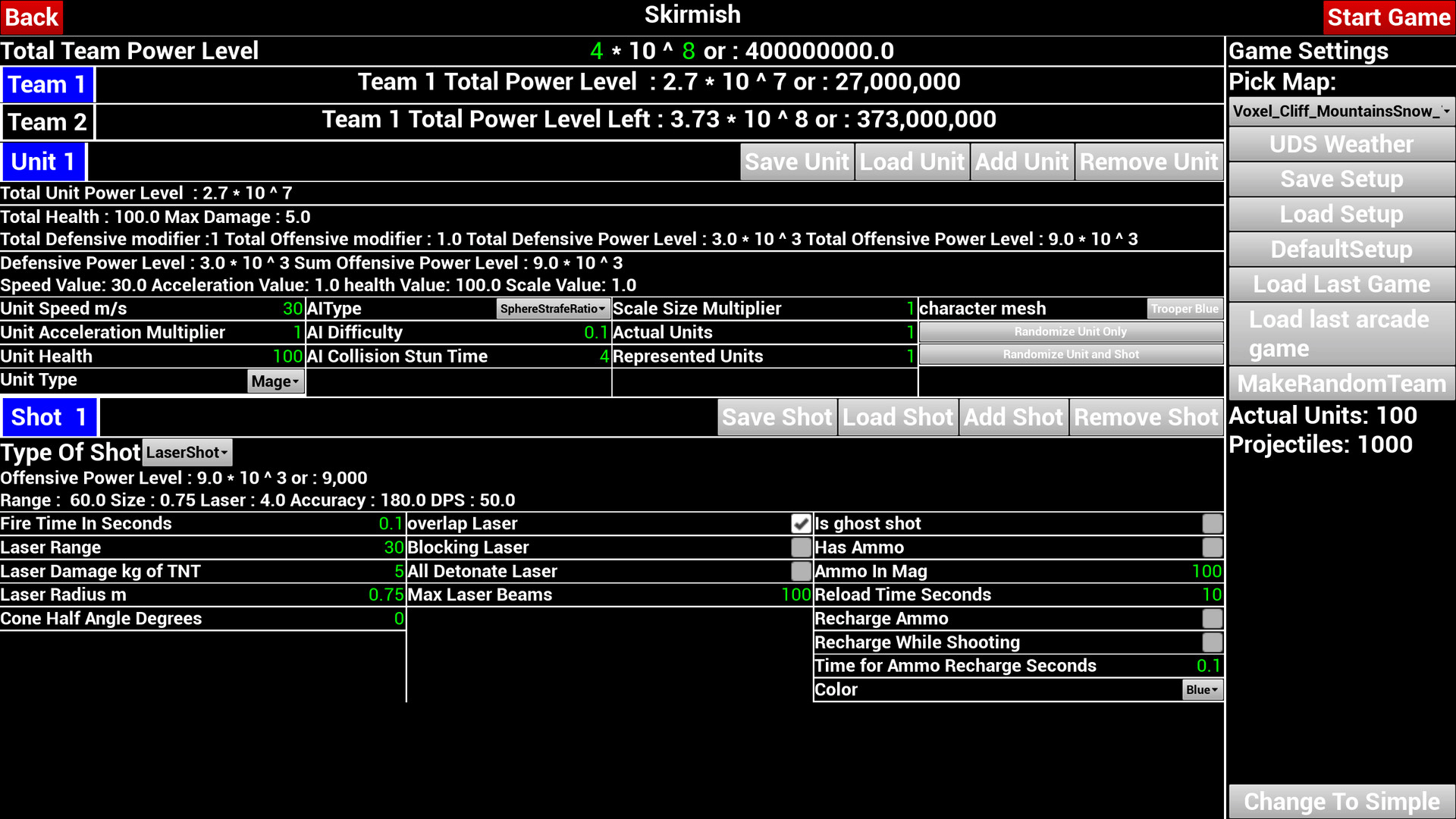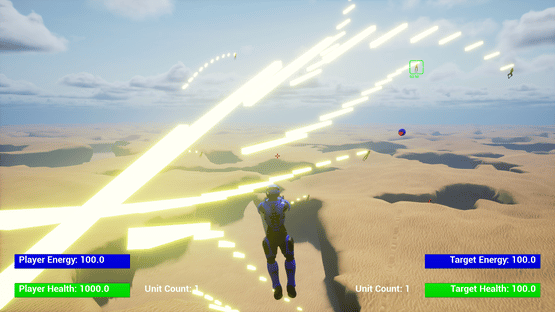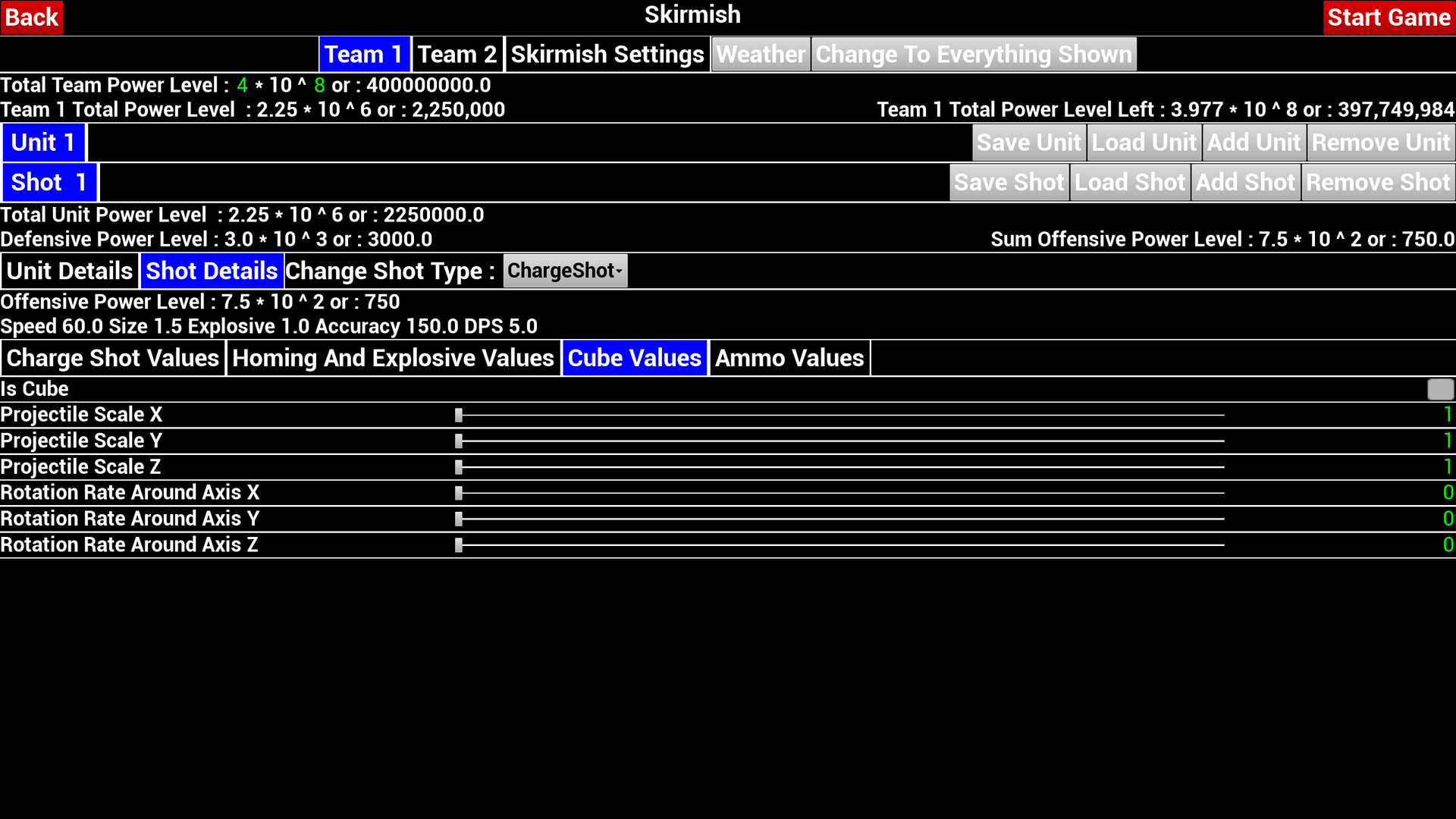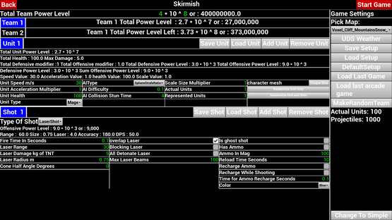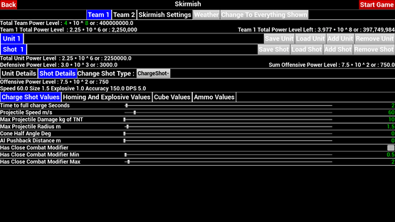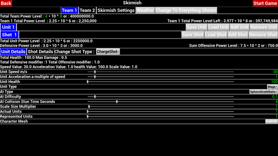 A flying third person shooter with the ability to edit the unit and shot attributes and calculate the resulting power level in game.