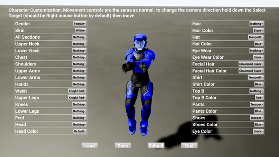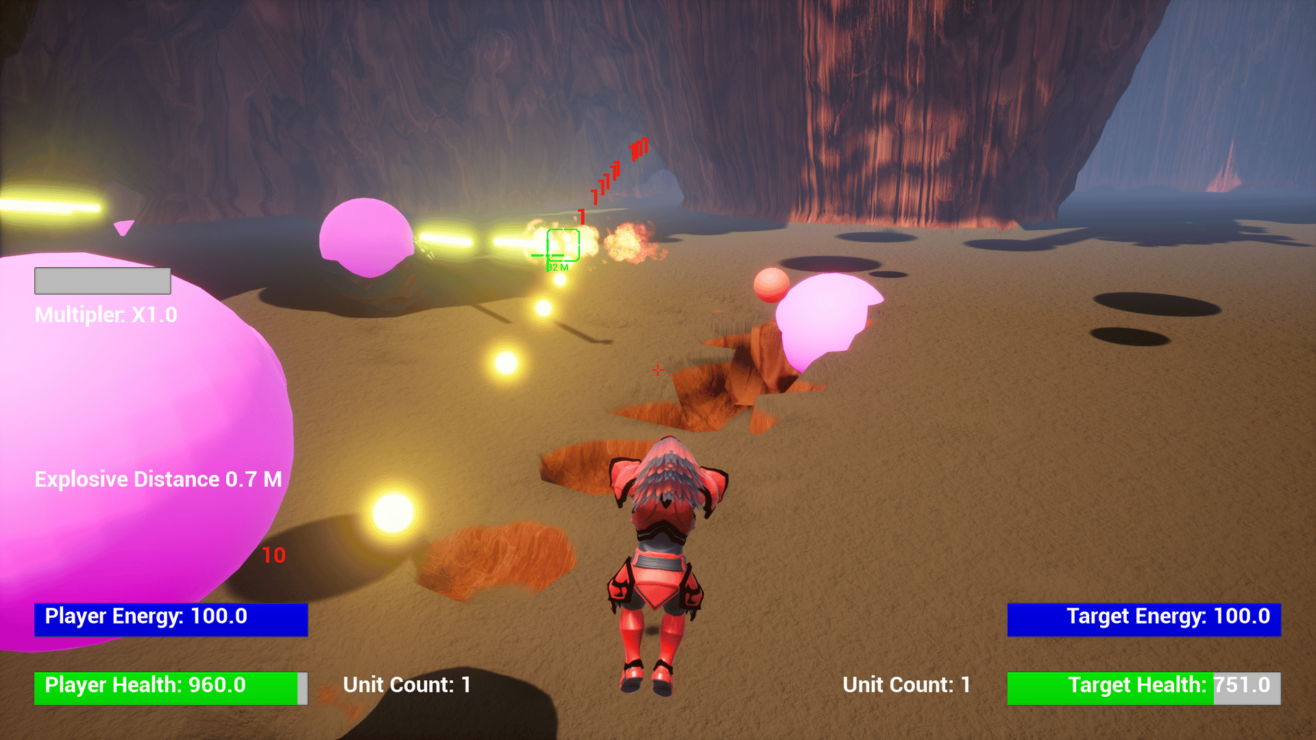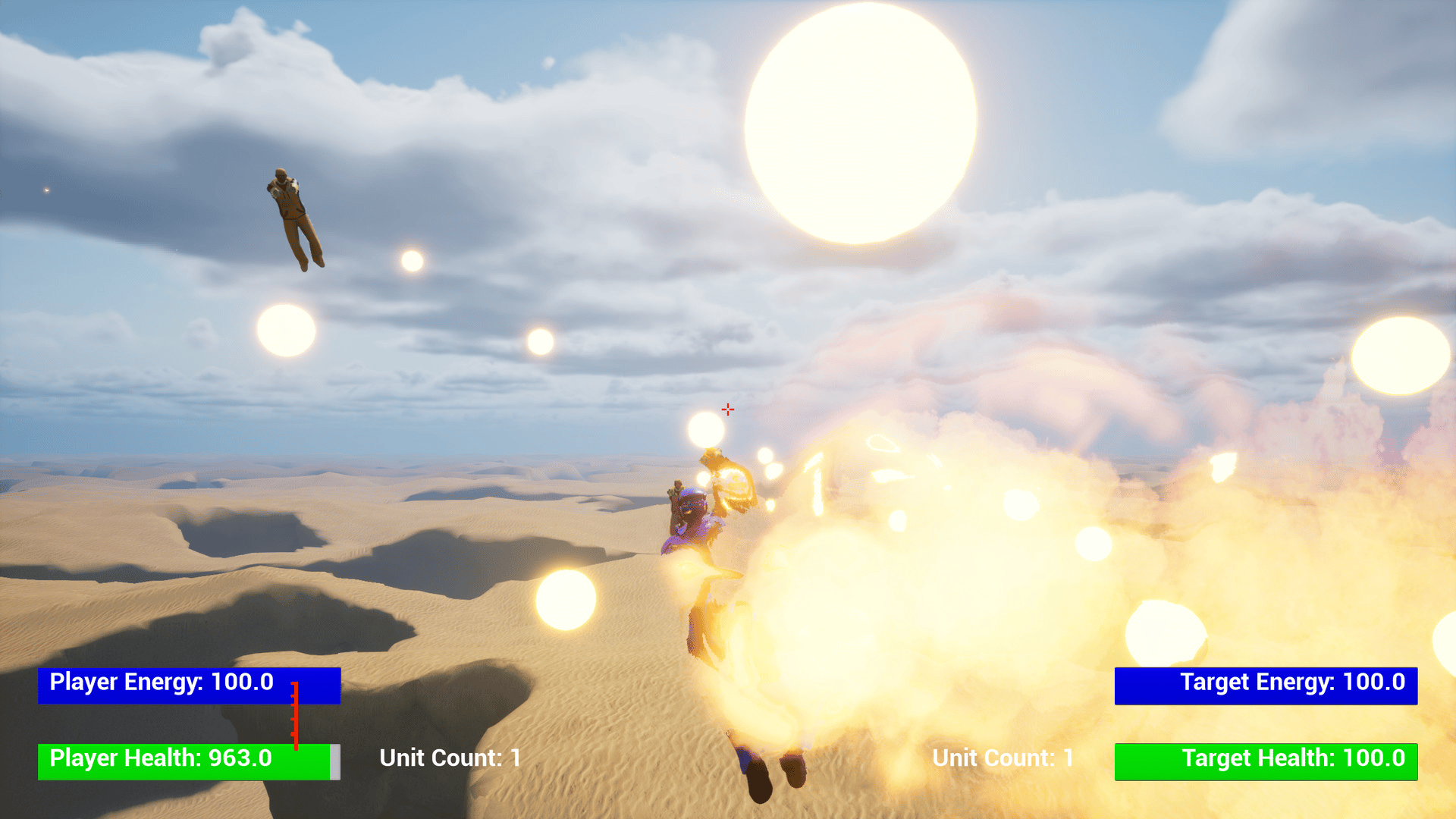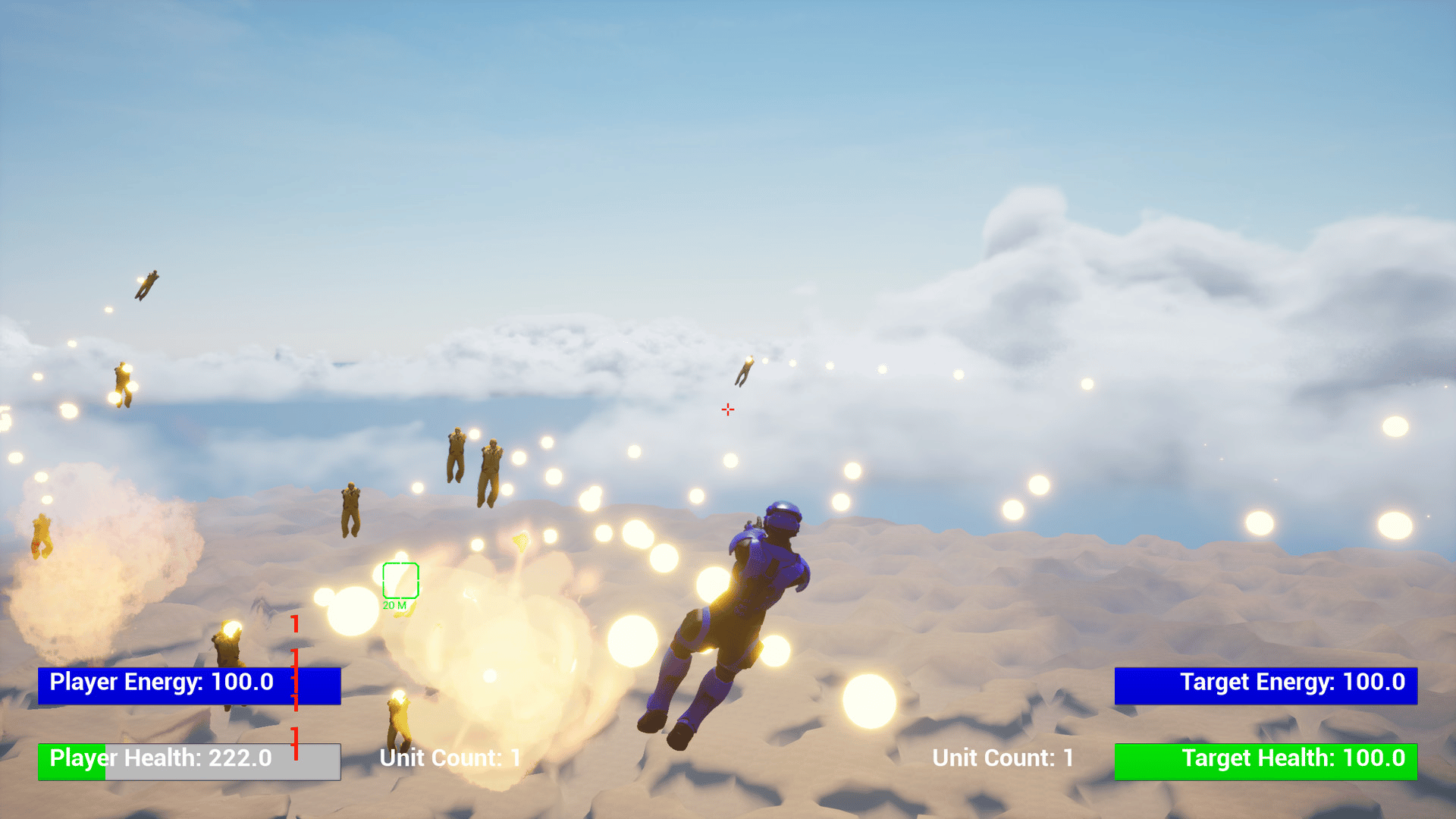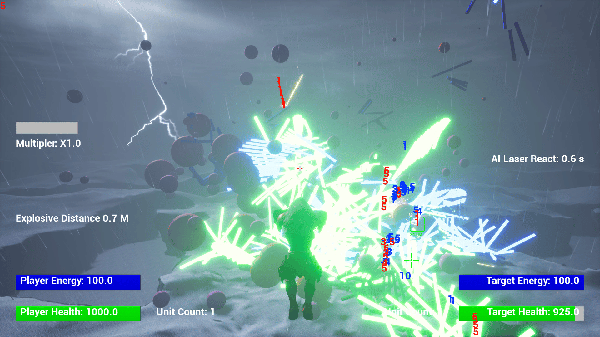 A flying third person shooter with the ability to edit the unit and shot attributes and calculate the resulting power level in game.