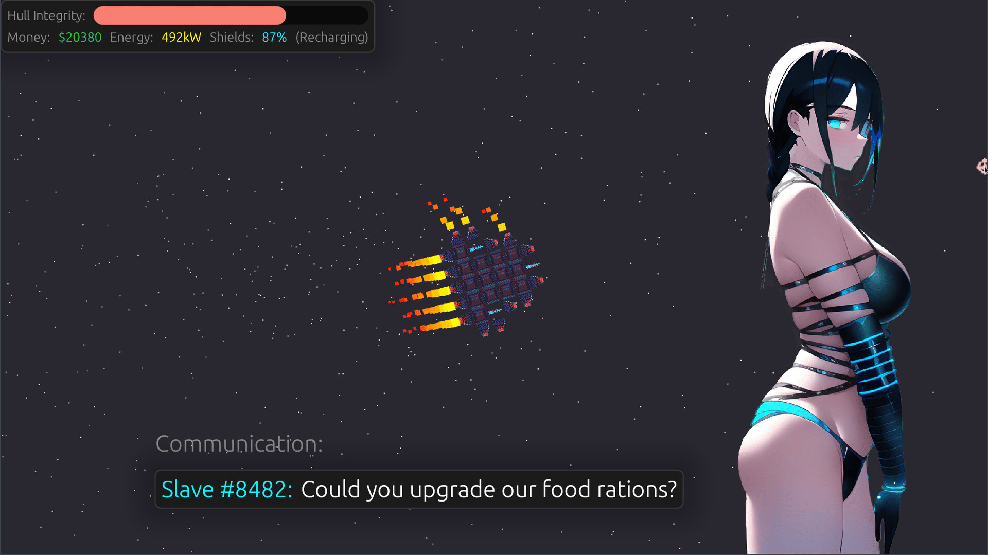 Space Slaves is a tactical space fighting game where an AI apocalypse destroys most of the human race, and the humans that survived are used by the AI as slaves to generate electricity by being placed in pleasure machines. Their emotions and pleasure are harvested by the AI to power their ships.