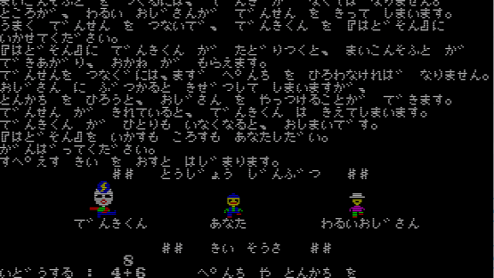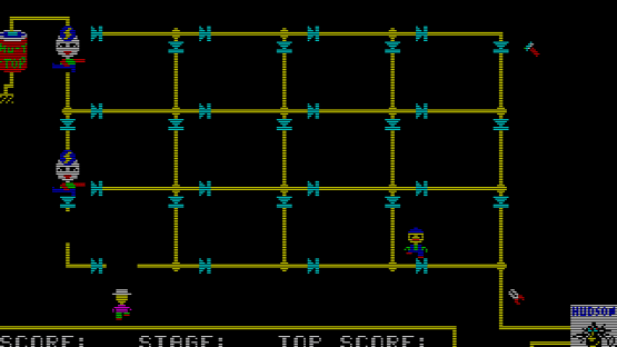 You are in charge of keeping a mischievous old man from cutting the power lines that connect to the Hudson Soft development room. Power comes from a battery on the upper left of the screen and is represented by white characters with bolts on their heads called “Electric-Kun”. They will slowly make their way to the development room and once they reach it a programmer will churn out a program and Hudson will make some money and you’ll get points! However if they run into an area without a line they’ll disappear.