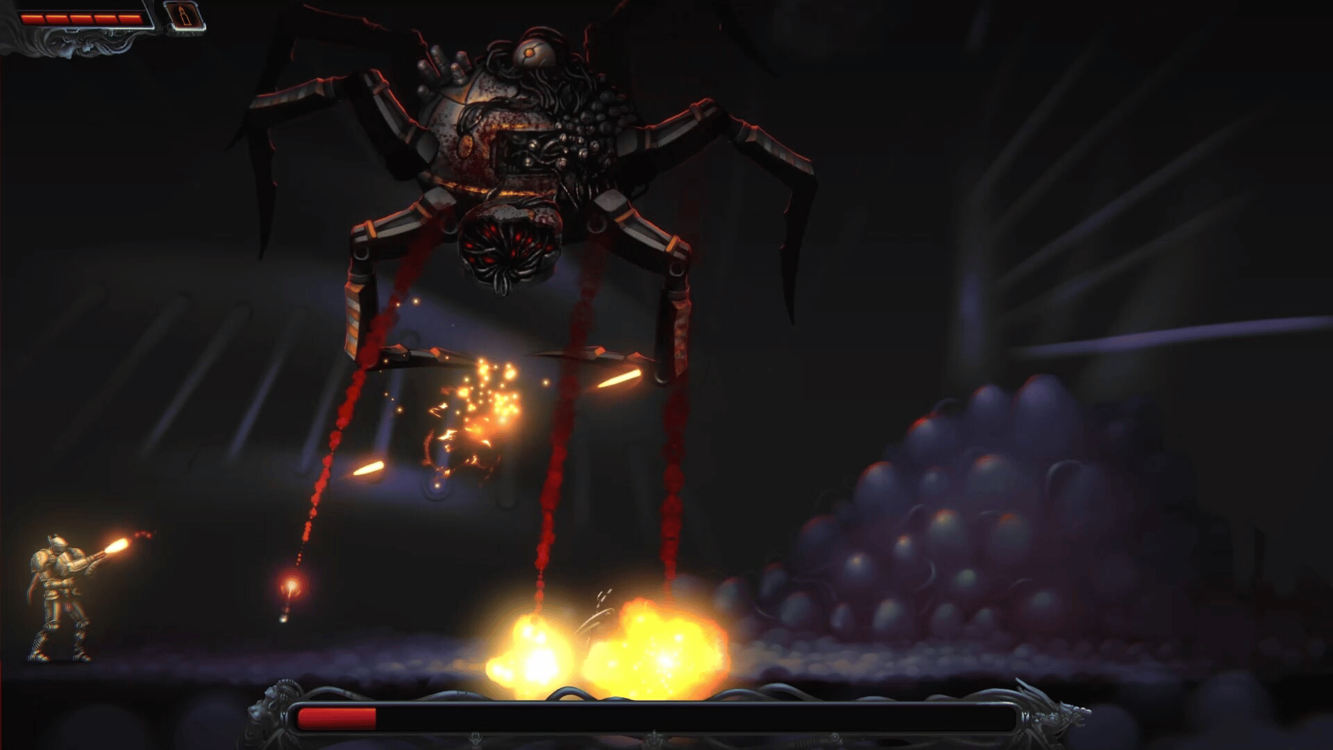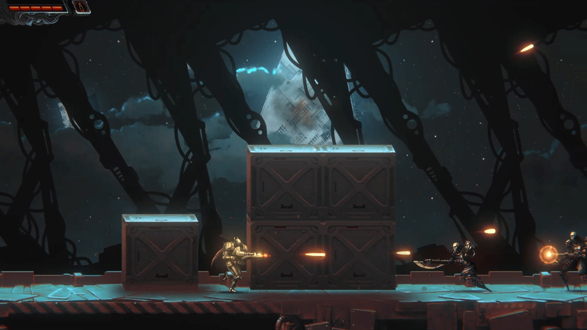 Shadows of Steel Moons is an action-platformer with dark techno-fantasy style. The story of a valiant knight who defeats mechanical gods and monsters.
