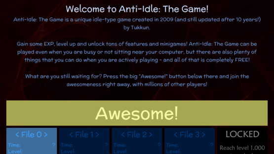 Idle Game created by Tukkun and playable exclusively on Kongregate, first released in 2009. The game follows standard idle game rules but also incorporates several elements from other types of games into one game. It actually lets you toggle whether you are idle or not - if you aren't idle, not only will you get the rewards from playing whatever part of the active game you're playing, you'll also get more rewards than if you just left it on idle.