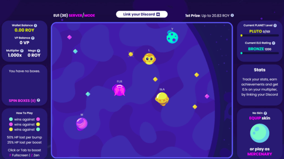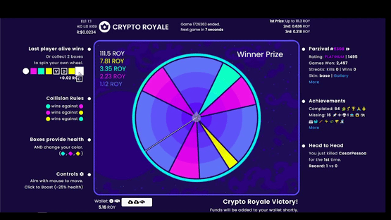 Crypto Royale is a browser-based, free-to-play, play-to-earn crypto game in which players compete for fame, glory and a little profit. Last man standing wins crypto. No up-front investment. No downloads. No signups. Get into a game in 30 seconds and win! The game is purposefully designed to be simple to play yet difficult to master. Every day 1000+ players congregate on the battlefield as they fight to see who can survive and claim the game’s HRC-20 token – ROY.