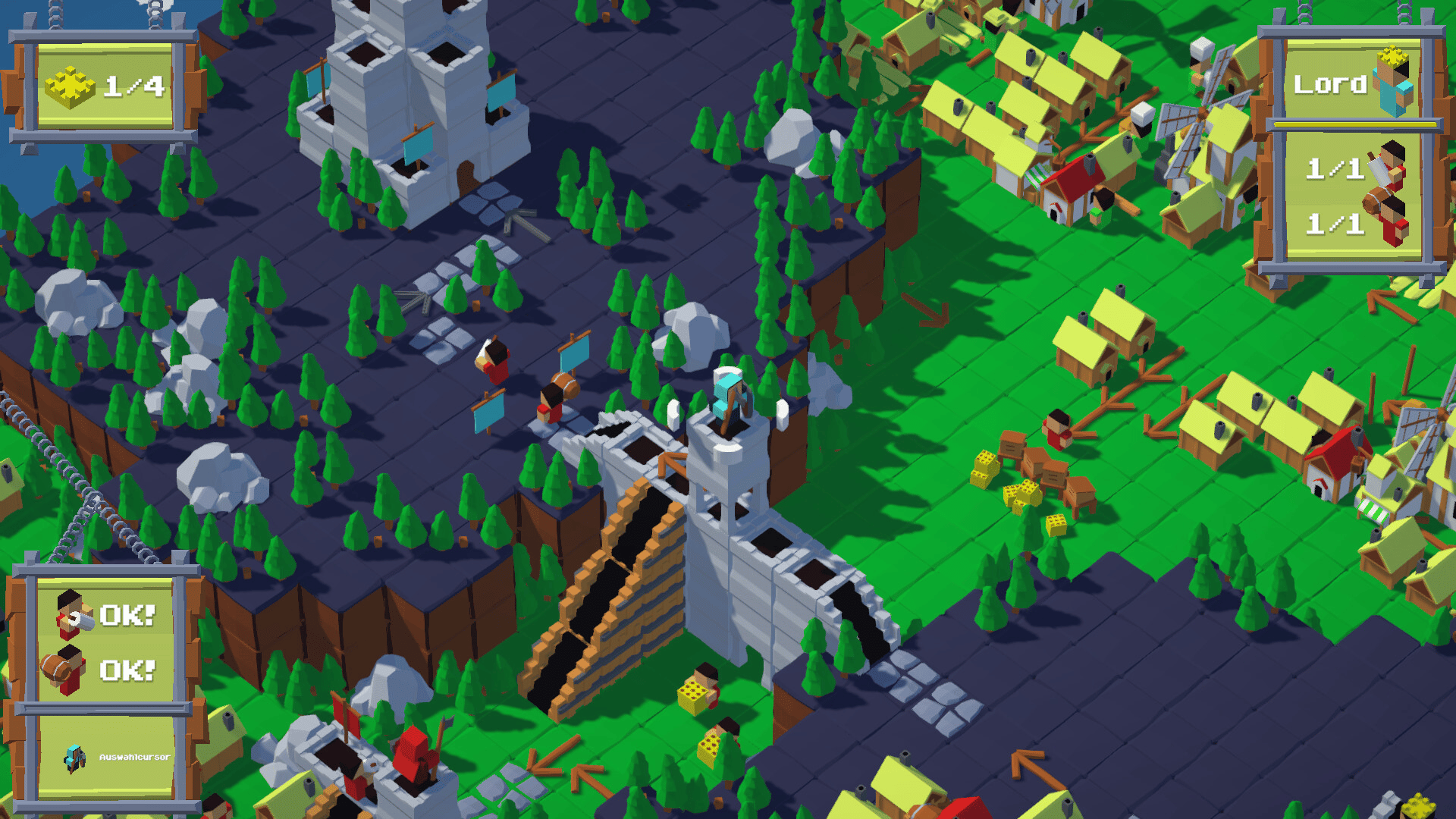 For the crown is a Puzzle/Supply-chain game where the player obeys the crown's orders to build and develop a production chain to create items and charakters. The demands of the crown will increase according to the level, making the game and the tasks more and more complex.