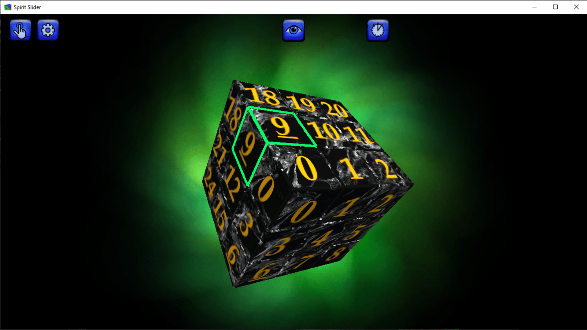 Spirit Slider features five sliding puzzle games. Each puzzle game consist of 27 game pieces that have the ability to slide anywhere within a 3 x 3 x 3 grid.