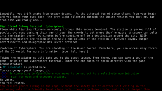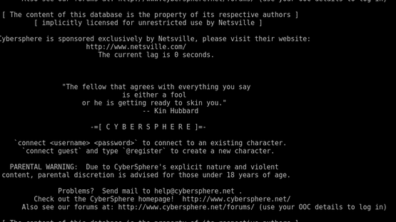 CyberSphere is a Role-Playing MOO set in a dark American future. Your virtual journey begins in New Carthage, the denizens of which range from the benign eccentric to the malicious psychotic. Shadowed alleys conceal dark secrets, and gleaming towers of urban wealth hide fantastic conspiracies.