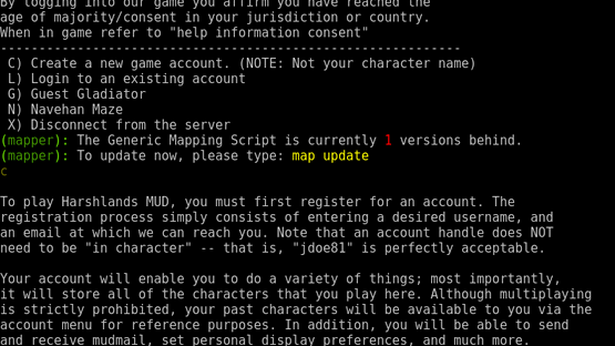 The Harshlands MUD is, above all else, a role-playing game world. The game should be viewed in most ways as a traditional sit-down, pencil and paper, role-playing game, and not as a video game where the object is to tally the most kills. You can become better at your chosen trade, buy/sell, travel, fight, get a job and the scope is pretty much endless.