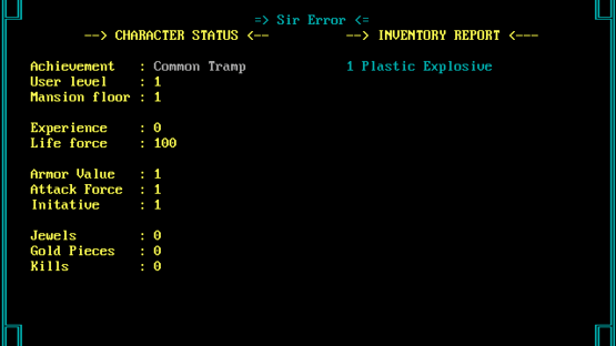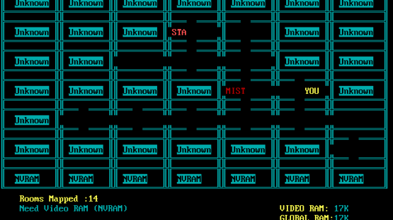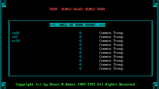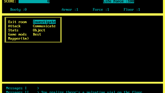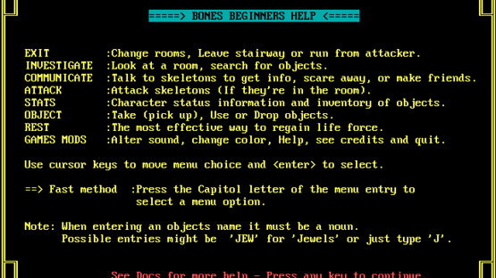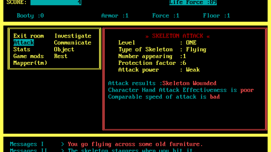 Bones: The Game of the Haunted Mansion is a member of the pseudo-roguelike Wizard's Castle family. It is one of the oldest games of this family, originating in 1981 on DEC mainframes. The story is quite conservative: As in the other Wizard's Castle games, your task is to descend into a dungeon to find the all-powerful Globe of some mighty Warlock on the deepest level. The gameplay is a hybrid of boardgame-like exploration and roguelike dungeon crawl, the whole presented as in "windowed" interactive fiction game, while the setting is a mix of fantasy, horror and sci-fi elements, playing in a haunted mansion filled with dust, bones, undead skeletons, RAM chips needed for auto-mapping, Uzis and Laser guns, etc. The only graphics is the BGI title screen; the rest of the game plays in text mode and reminds late DOS applications with windows.