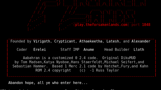 Aabahran is a multi-user dungeon, or MUD. A MUD is a multi-player computer game that combines elements of role-playing games, hack and slash style computer games and social chat rooms. MUDs are text-driven, where players read descriptions of rooms, objects, events, other characters, and computer-controlled creatures or non-player characters (NPCs) in a virtual world. Aabahran has been in existence since June of 2000, ranking it in line with many of the long-standing MUDs still in existence. Its world is rich, dynamic and exciting. It is also a roleplaying-enforced, playerkilling MUD. What this means is that in Aabahran, you are required to play a character to its full extent. Additionally, you may kill other players (after a certain rank and within our highly balanced playerkilling ranges). In fact, because Aabahran has a balanced rare & unique item system, you may need to kill other players in order to get that special sword or shield you’ve been looking for! The world is massive, with over 10,000 unique rooms for you to explore. Because of the variety of races and classes, the game remains fresh and exciting, and endlessly replayable.