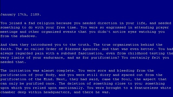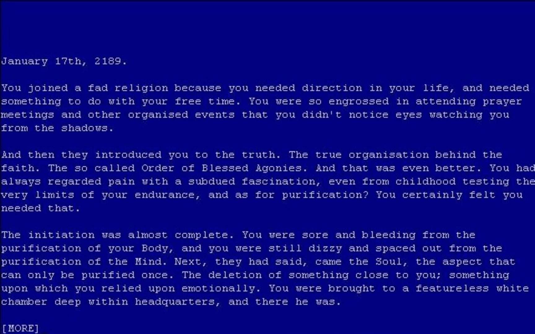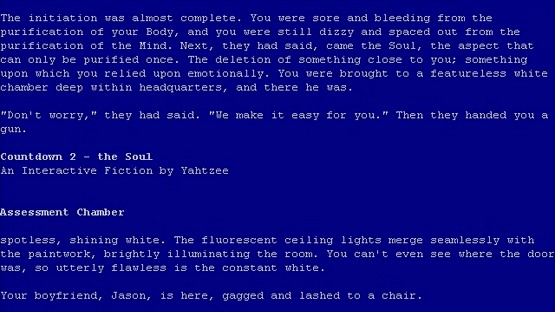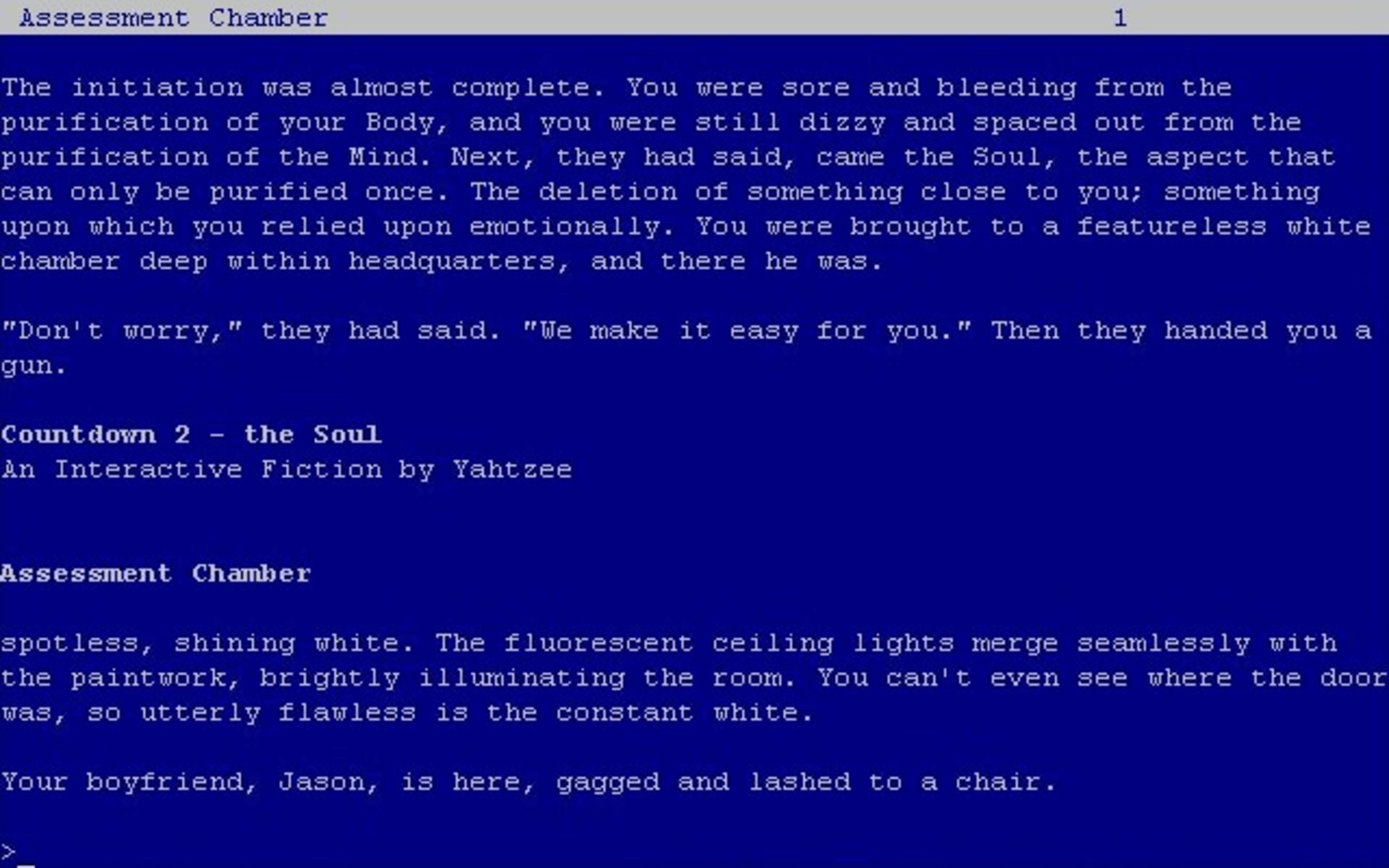 Countdown 2 - The Soul is the second of a trilogy of text adventure games released as a prequel, of sorts, to 6 Days a Sacrifice. Many of the events depicted expand on events in Trilby's Notes or 6 Days a Sacrifice. You are a new acolyte in the Order of Blessed Agonies. You have already purged your body and mind. Now you must purge your soul by killing your boyfriend Jason. The nightmares from that day still haunt you. You wander out of the women's dormitory and end up in the courtyard, where you meet a stranger in a tattered red robe. He has a task for you.