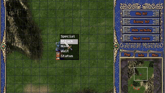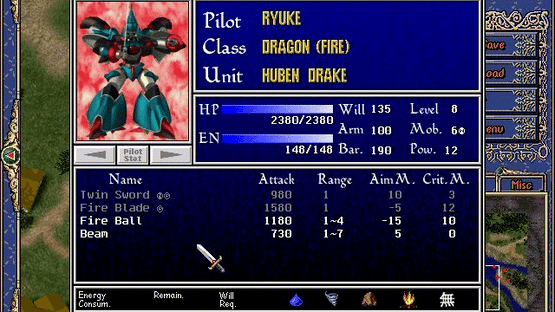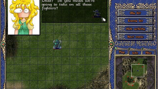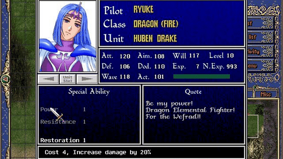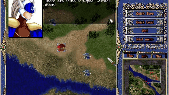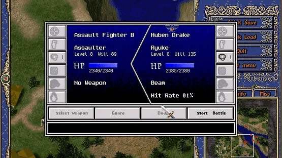 Battle of the Youstrass is a shareware Japanese-style tactical role-playing game. The game takes place on the world of Youstrass where two countries share a single continent and where technology and magic co-exist. One of the countries, Kradion, is largely frozen. Its people are famous for their mercenary soldiers and mechanical fighters. The other country, Welfrad, is prosperous and fertile. Kradion depends on imported food. When the great famine struck there was no food available and times were hard, so Kradion attacked Welfrad, all but destroying Welfrad's royal knight units. Just a few ace units survived because they were not in the capital when the attack came. Among these is Ryuke, aka Blue Wing, chief knight of the royal army, who pilots the elemental fighter Huben Drake. The game starts with Ryuke separated from surviving units. He must survive and join his comrades to wage guerrilla war on the enemy. The game consists of large-scale tactical battles, which are played on an isometrically viewed map, only part of which can be seen at once. There is a mini map in the lower left of the screen which shows the whole game area and the location of any other units, both friends and foe. During actual battles between units the game switches to a different view which displays the combat. As combat progresses the character collects experience points, special items, and additional special abilities.