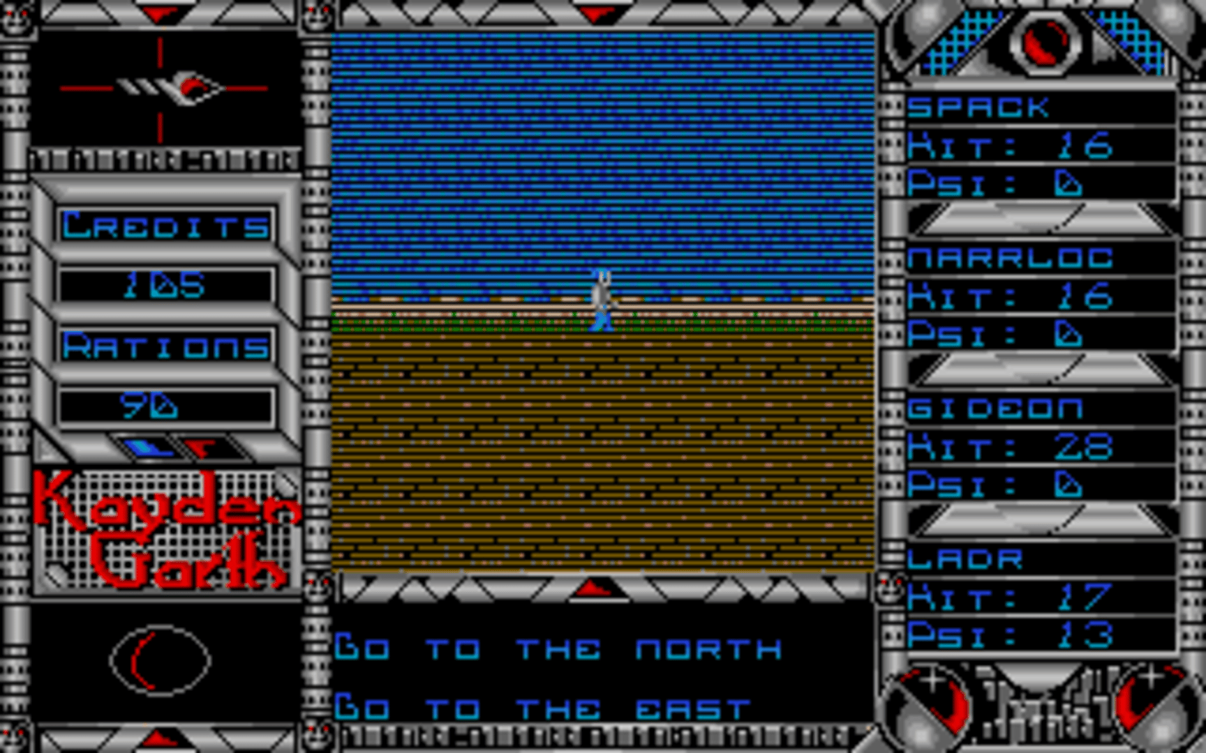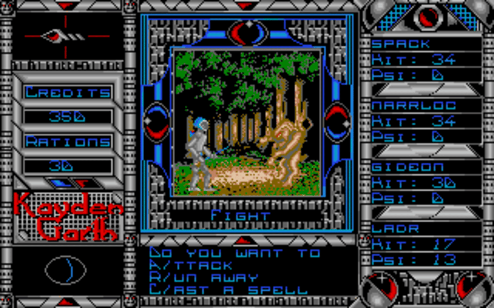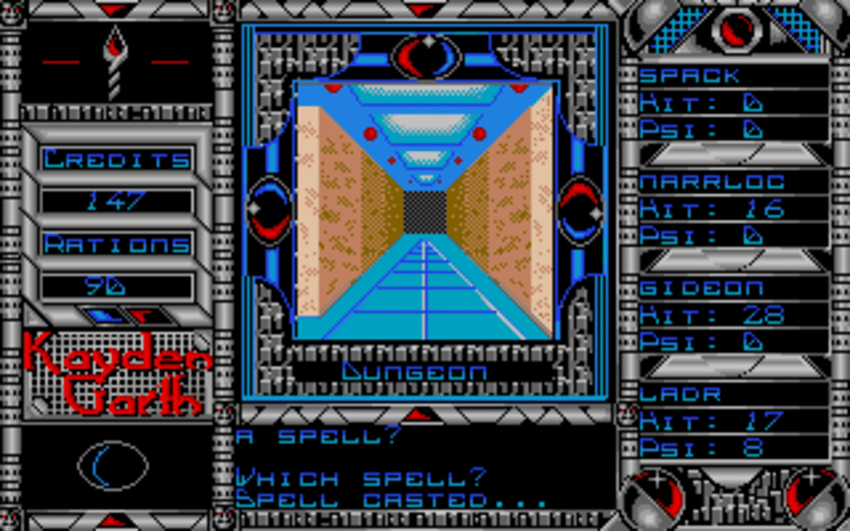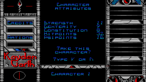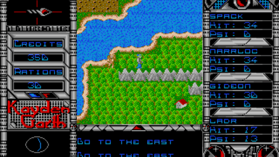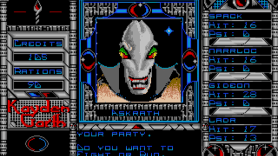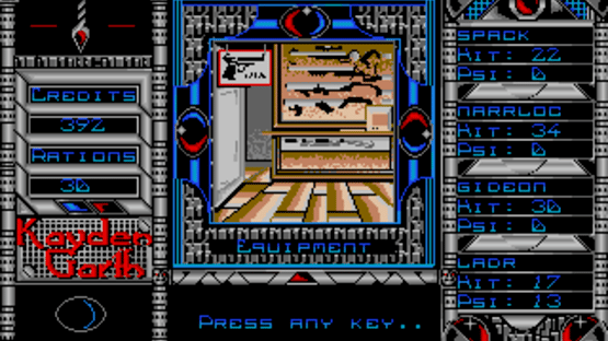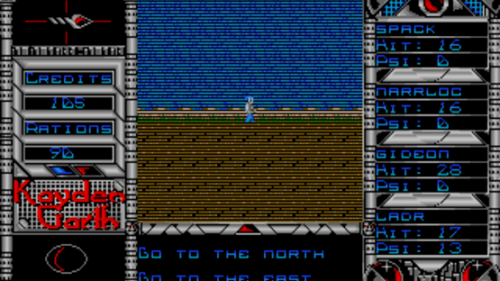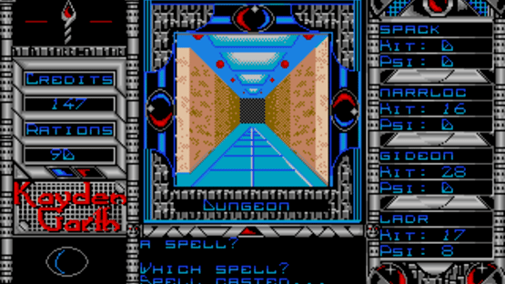 An emergency call is received from a surveillance station overseeing the prison planet of Kayden Garth, indicating that the station may have inexplicably been dragged into the penal colony and its crew disappeared. A task force of four undercover agents is sent to Kayden Garth to investigate the source of the signal. Kayden Garth is a role-playing game that is controlled in the style of Ultima, alternating an overhead world map to first-person dungeon crawling. The player assembles a party of four by picking each character out of eight possible alien races and eight classes, with some classes being available to certain races only. Some mutant races are able to cast psionic spells, including light, healing, teleport, attack spells and seeing the dungeon map. Combat is extremely simplified, taking place against one opponent at a time and only allowing a choice between attacking, casting spells or fleeing. There is no micromanagement of party members or their inventory. The game includes a form of economy, with credits that can be looted from defeated monsters, bet in casinos and used to buy weaponry, shields, torches and rations. Light sources, along with light spells, are essential to the exploration of dungeons.