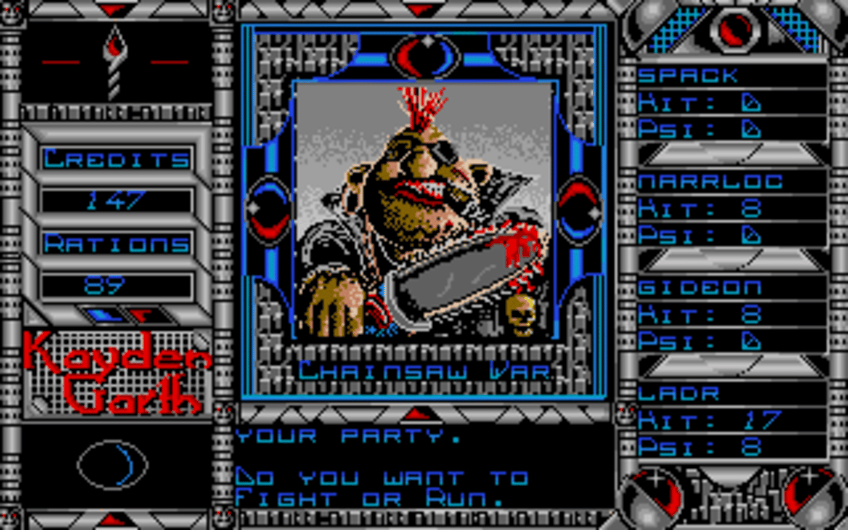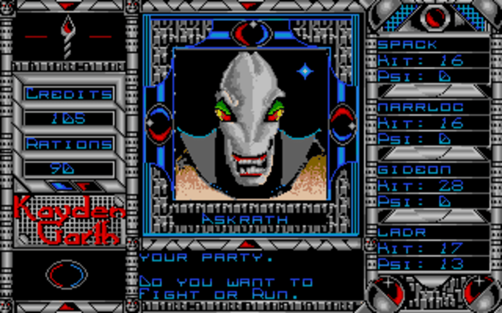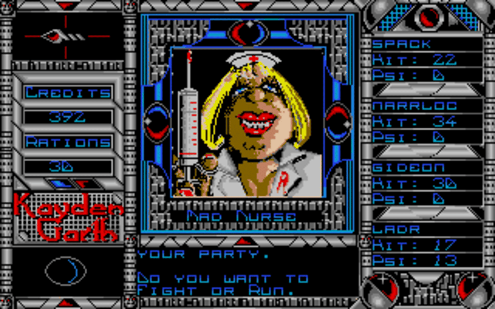 An emergency call is received from a surveillance station overseeing the prison planet of Kayden Garth, indicating that the station may have inexplicably been dragged into the penal colony and its crew disappeared. A task force of four undercover agents is sent to Kayden Garth to investigate the source of the signal. Kayden Garth is a role-playing game that is controlled in the style of Ultima, alternating an overhead world map to first-person dungeon crawling. The player assembles a party of four by picking each character out of eight possible alien races and eight classes, with some classes being available to certain races only. Some mutant races are able to cast psionic spells, including light, healing, teleport, attack spells and seeing the dungeon map. Combat is extremely simplified, taking place against one opponent at a time and only allowing a choice between attacking, casting spells or fleeing. There is no micromanagement of party members or their inventory. The game includes a form of economy, with credits that can be looted from defeated monsters, bet in casinos and used to buy weaponry, shields, torches and rations. Light sources, along with light spells, are essential to the exploration of dungeons.