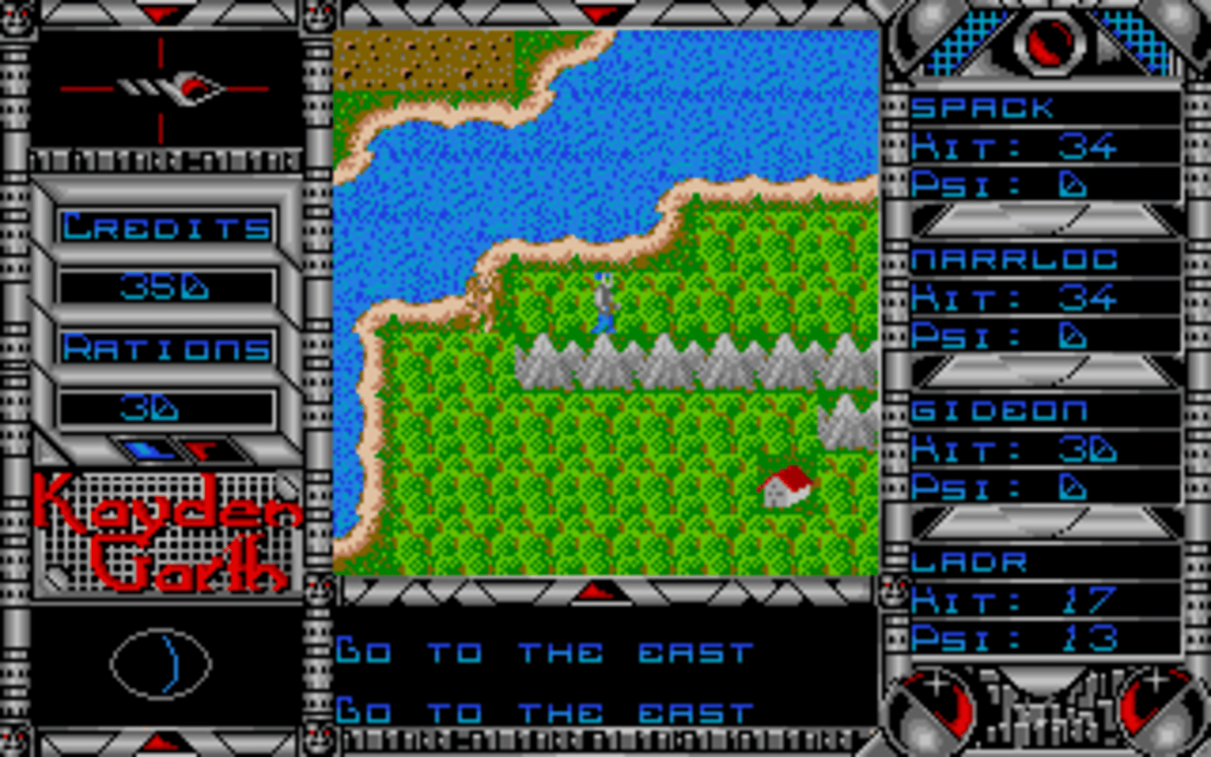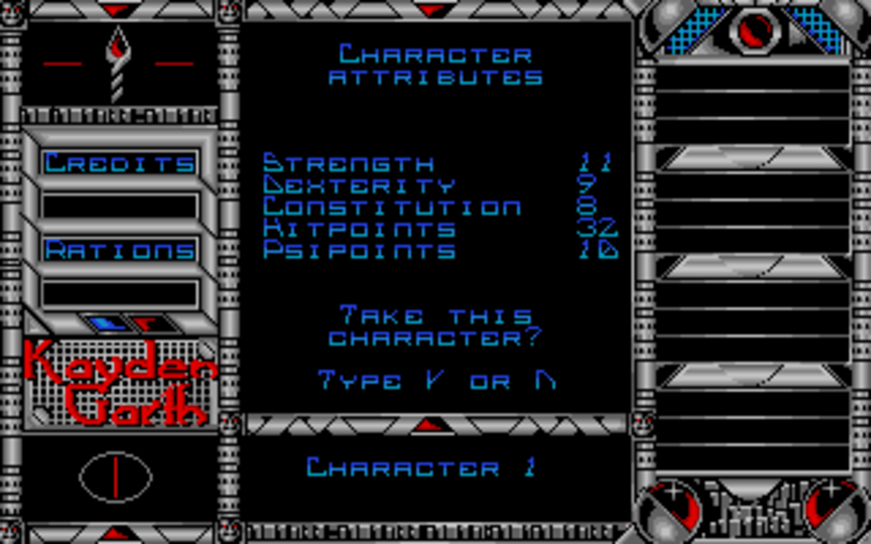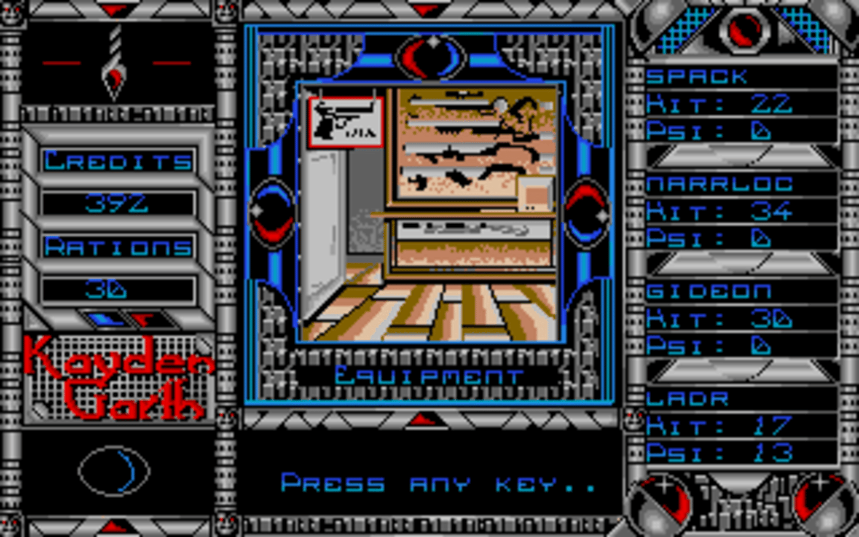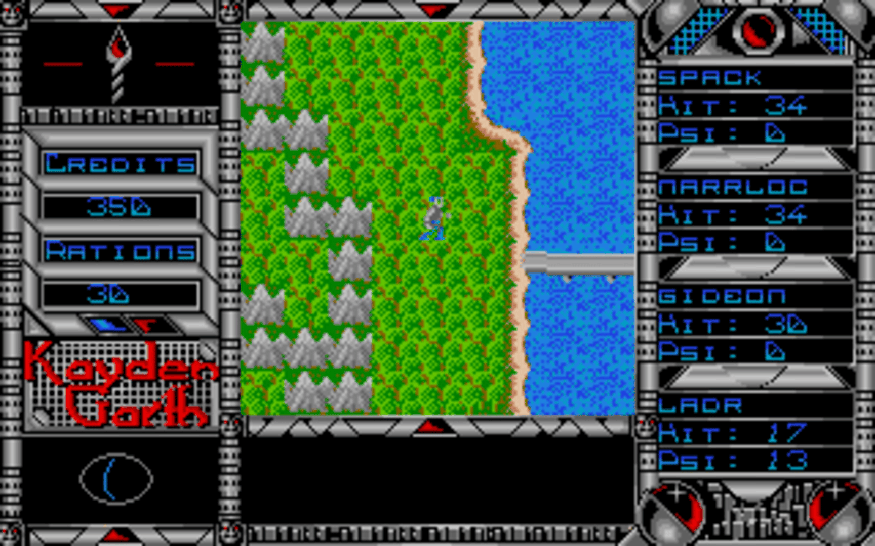 An emergency call is received from a surveillance station overseeing the prison planet of Kayden Garth, indicating that the station may have inexplicably been dragged into the penal colony and its crew disappeared. A task force of four undercover agents is sent to Kayden Garth to investigate the source of the signal. Kayden Garth is a role-playing game that is controlled in the style of Ultima, alternating an overhead world map to first-person dungeon crawling. The player assembles a party of four by picking each character out of eight possible alien races and eight classes, with some classes being available to certain races only. Some mutant races are able to cast psionic spells, including light, healing, teleport, attack spells and seeing the dungeon map. Combat is extremely simplified, taking place against one opponent at a time and only allowing a choice between attacking, casting spells or fleeing. There is no micromanagement of party members or their inventory. The game includes a form of economy, with credits that can be looted from defeated monsters, bet in casinos and used to buy weaponry, shields, torches and rations. Light sources, along with light spells, are essential to the exploration of dungeons.