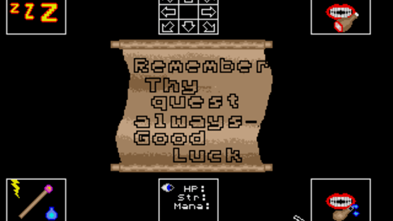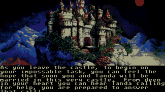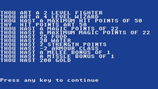 Quest for Tanda is a RPG based on Robert Asprins Myth-series written in GFA Basic. You are one of Aahz's knights and his daughter, Tanda, has been kidnapped. It is the evil Istvan who is behind it and he is demanding a ransom of 1.000.000 gold. Now it's your job to rescue her. You can choose to play one of three characters: Skeeve, Garkin or Frumple. Your adventure takes place in the land of Khlad, a land with two castles and six towns. A grid divides the map into 8 x 7 squares. At the games main menu you can select you desired action: Rest, Eat, Drink, Move, Cast spell, check your stats or remind yourself of your quest. After each move there might be a fight. There are two difficulty settings; hard and easy. If you select hard you have to search for the boat (Istvan lives on an island) by going to various towns and listen to the hints the towns people offers you. If you select easy you can ignore that and go straight to the town on the North Peninsula and someone there will tell you how to defeat Istvan.