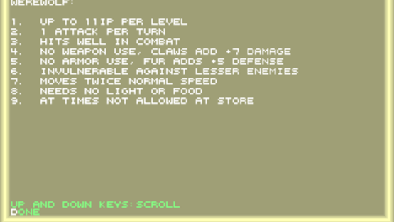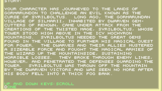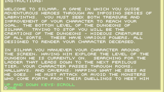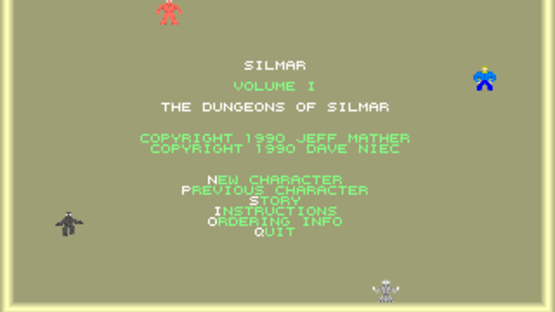 Silmar is a rogue-like/hack type of RPG, with random generated dungeons, in which you as an adventurer are descending to fight monsters and find treasure. The game was first released for DOS around 1990, with later incarnations running on Windows, Linux and OS/X. The DOS version has tile-based graphics, and was split in three parts. The first (Dungeons of Silmar) was distributed as shareware, and the second (An Everpresent Magic) and third (The Forward Terminus) parts were made available with the purchase of the first part. The story is that the evil wizard Syrilboltus was defeated in a war with a dwarf country called Gormarundon, but left a cursed magic labyrinth of dungeons under his tower, crawling with monsters, nearby the village Silmarii, which needs to be cleansed and sealed by reaching the bottom of the dungeons. Many adventurers have tried but failed, and now you are to try your luck. You choose your character from a list of mixed characters, ranging from werewolves to baseball players (oh, the horror!), and venture forth. As is usual with these games, there is a shop in the village above where you can purchase necessities and sell any treasure you find below. You can reach the shop by using a teleport bead, so there is a quick way out if things get too hot below.