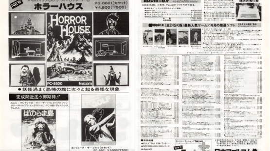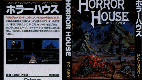 Horror House is the very first graphical adventure game published by Nihon Falcom in 1983. The title was created by a student of Kindai University named Fujio Fujimori who had previously had several games published inside the pages of Japanese computer magazines like I/O Magazine, RAM and others at the time. Horror House would be the first in a trilogy of games released by Falcom that were classified as "occultic mystery adventure" games with Horror House Part II releasing in December and Monster House releasing the next year in 1984.