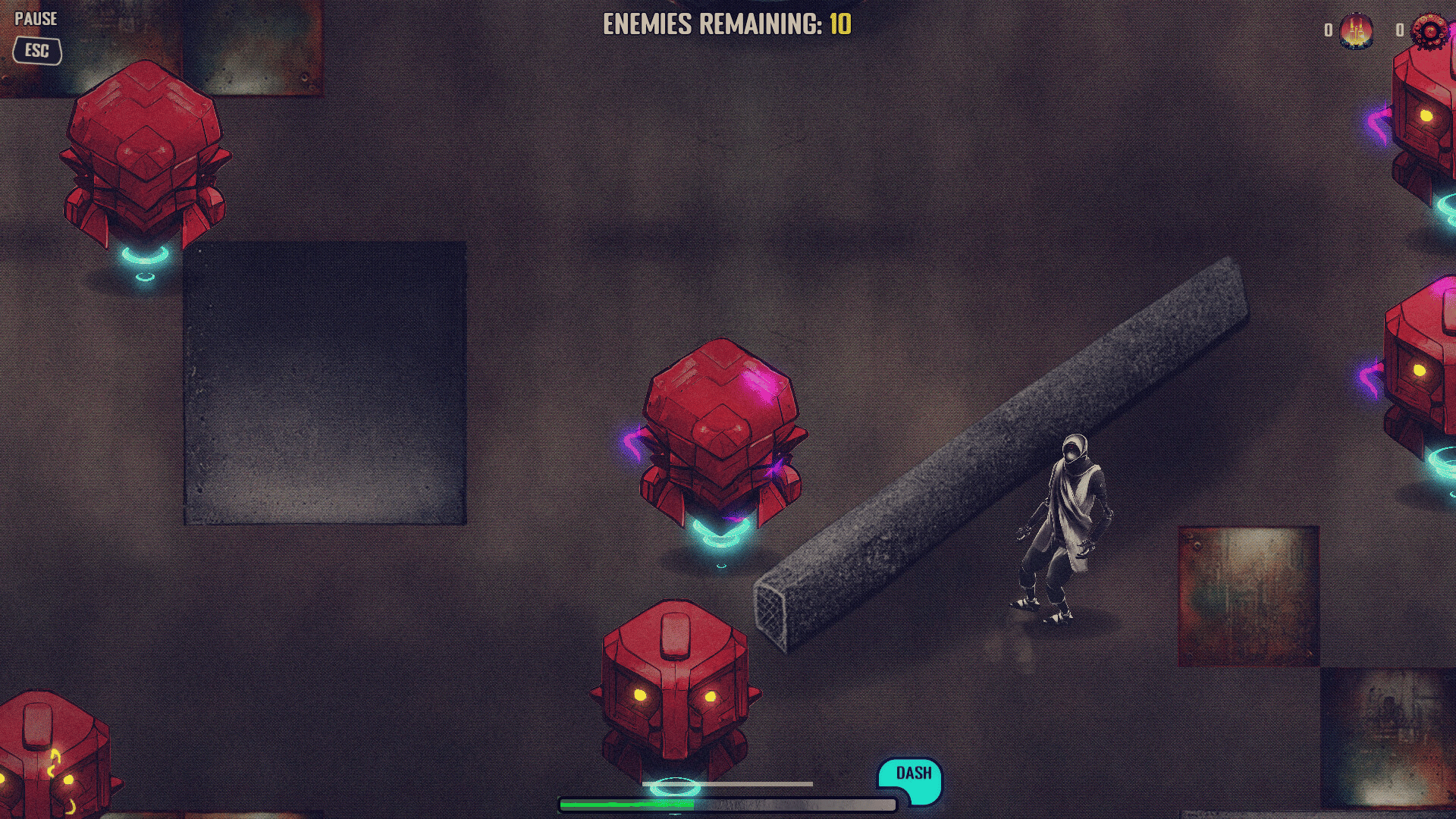 Spawn, dismantle your enemies to gather spare parts, die, repeat. Embark in a journey where unlocking the next upgrade will always be your priority, while cleaving your way through waves of enemy robots! Reach the secret endless mode to really put your skills to test.
