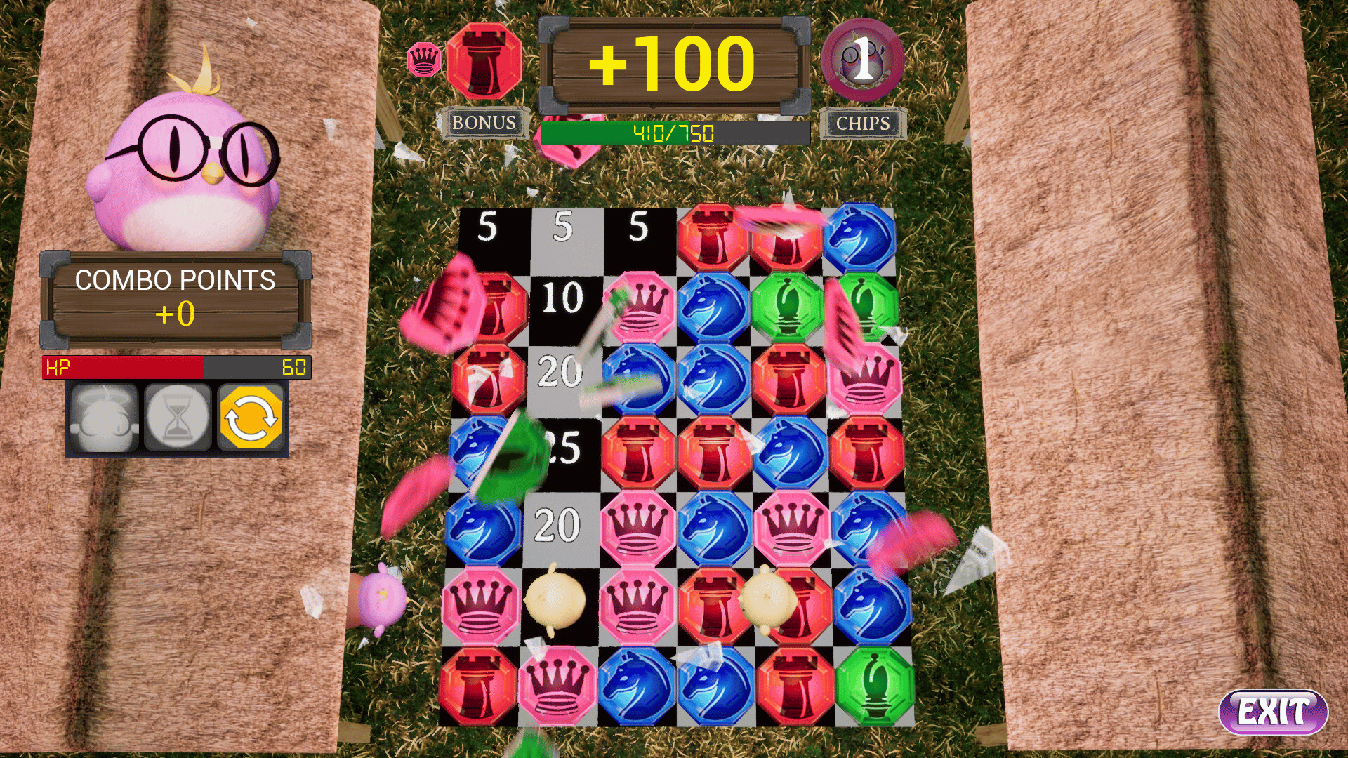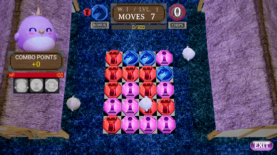 Chessie Chicken's Chess Match is a unique addition to the Match-3 genre. Pieces move like they do in Chess. Catch chicken's before they cross the board by matching pieces they are standing on. Earn chips and use them to purchase powerups. Earn combo points by catching 2 birds in one match!