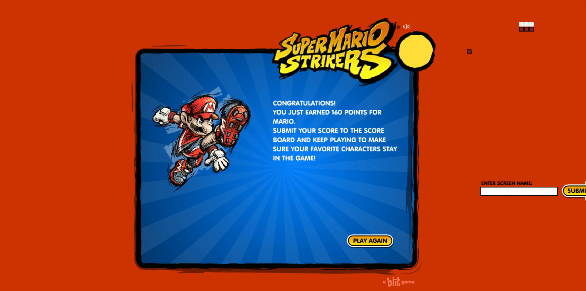 Super Mario Strikers was an online Adobe Flash game developed by Blit Interactive and published by Nintendo to promote the release of Super Mario Strikers on the Nintendo GameCube. It could be played from the official Blit Interactive website.